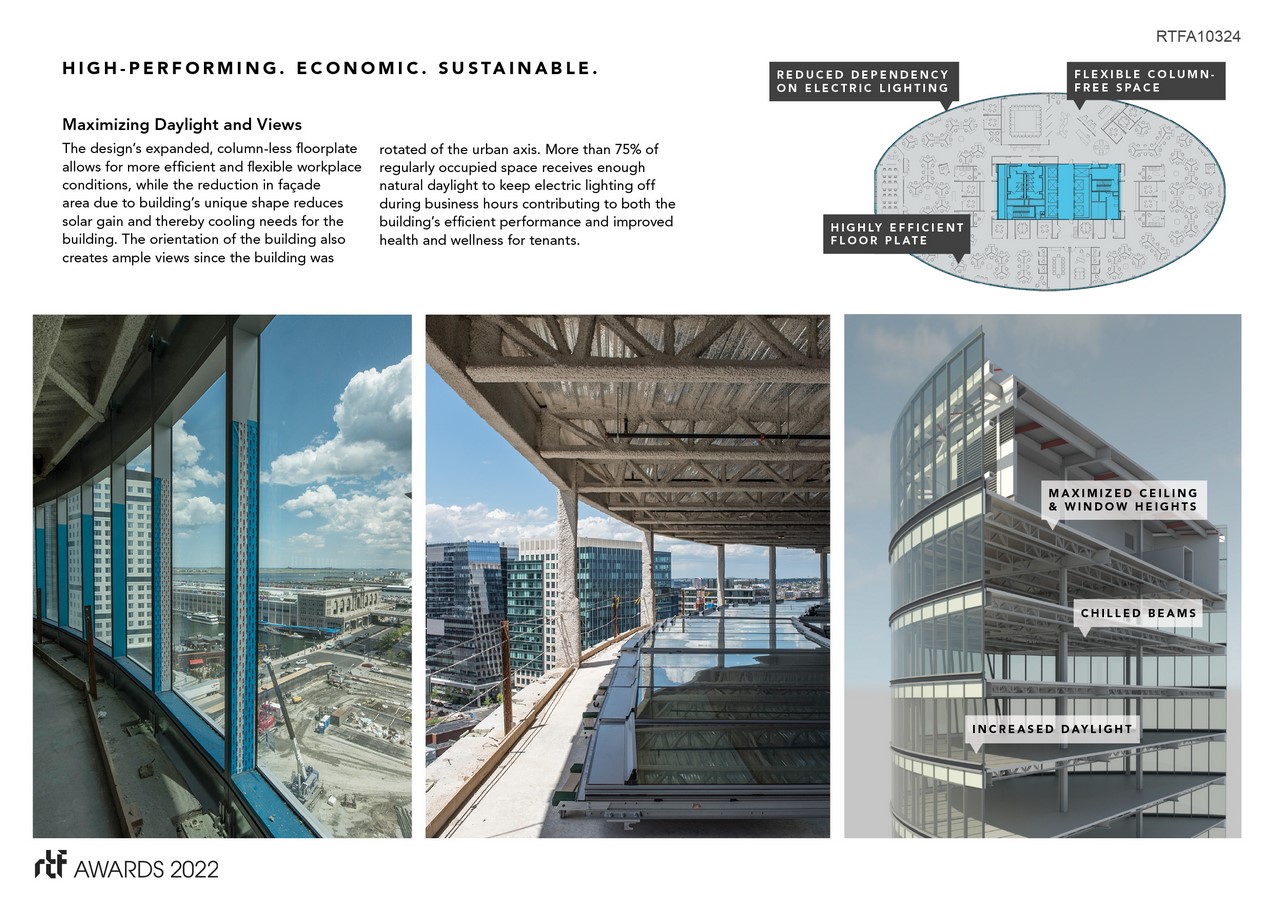 - A slender form, high floor-to-floor dimensions, and large windows allow for increased natural daylight, reducing reliance on electric lighting.