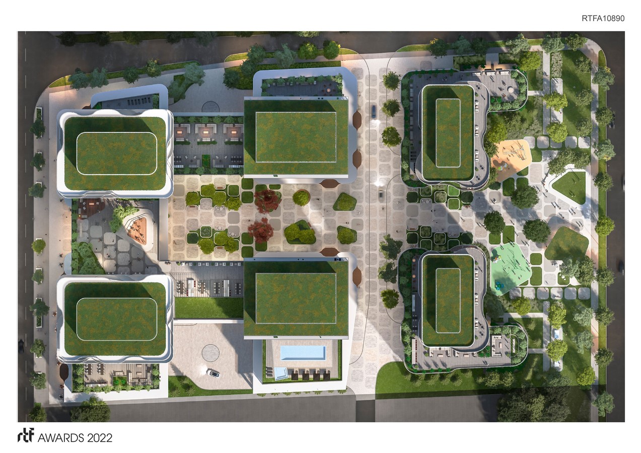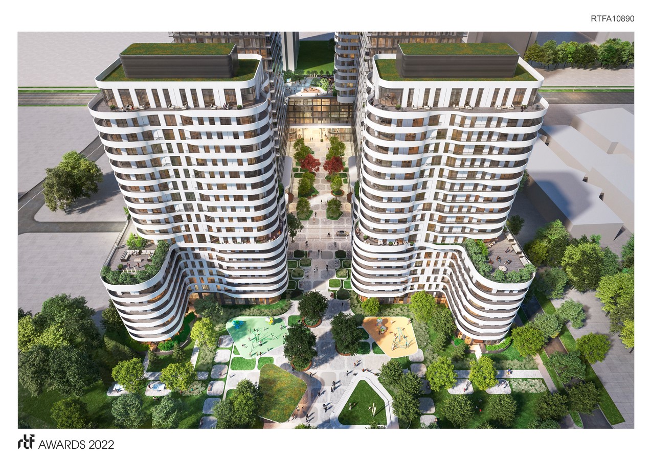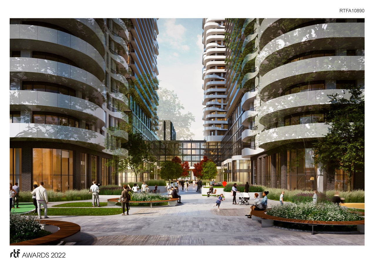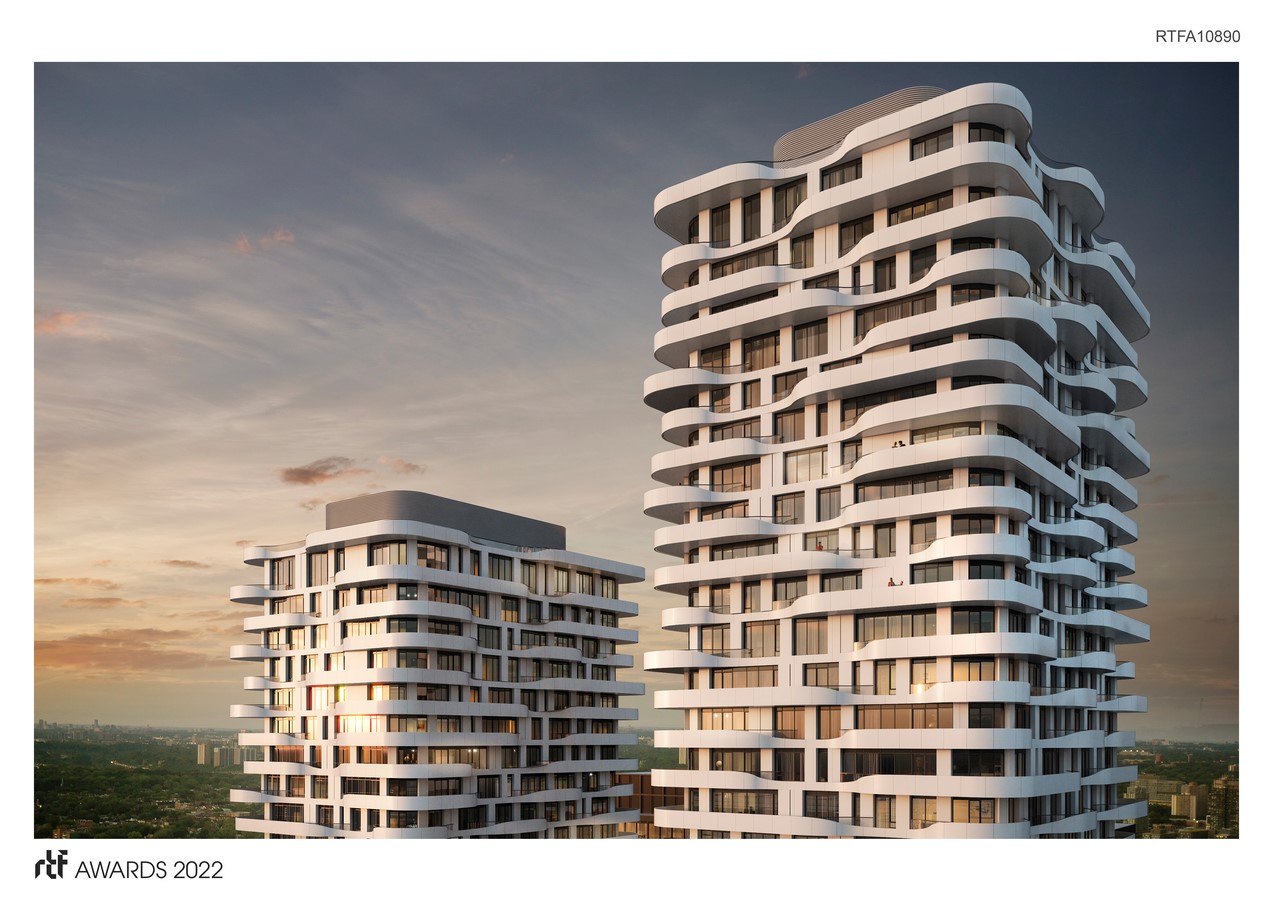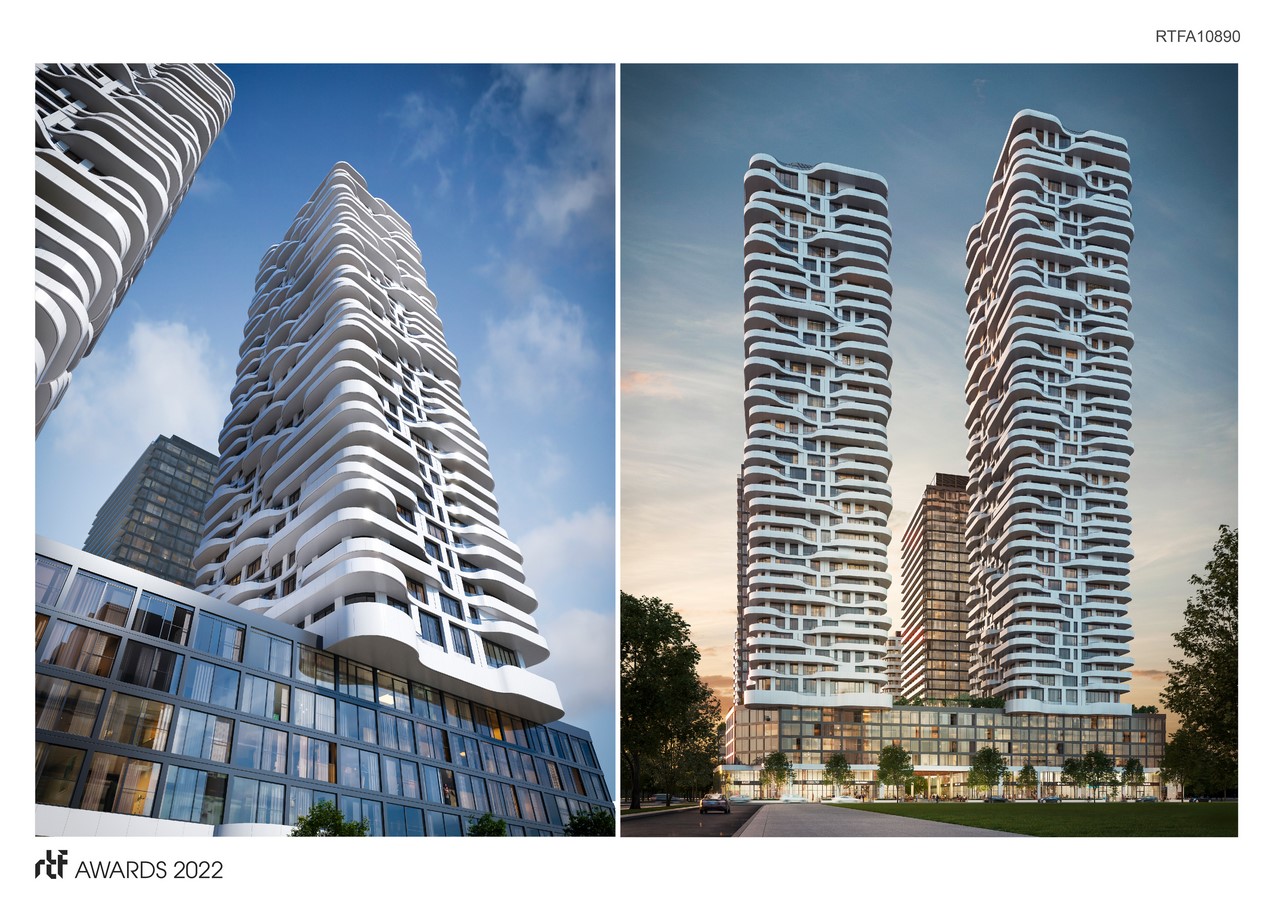 The towers typically have 1,200 square meter floor plates with 12 units, which makes slender masses that minimize overshadowing of open spaces. These towers are wrapped with architecturally distinctive strips of balcony. These curvilinear balcony-ribbons soften the profile of the towers, creating an organic sculptural presence in place of the typical boxiness of towers. The design intention is to introduce a level of architectural sophistication that enhances the status of this emerging neighbourhood.