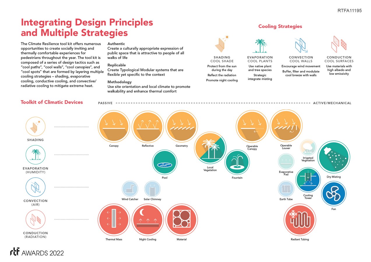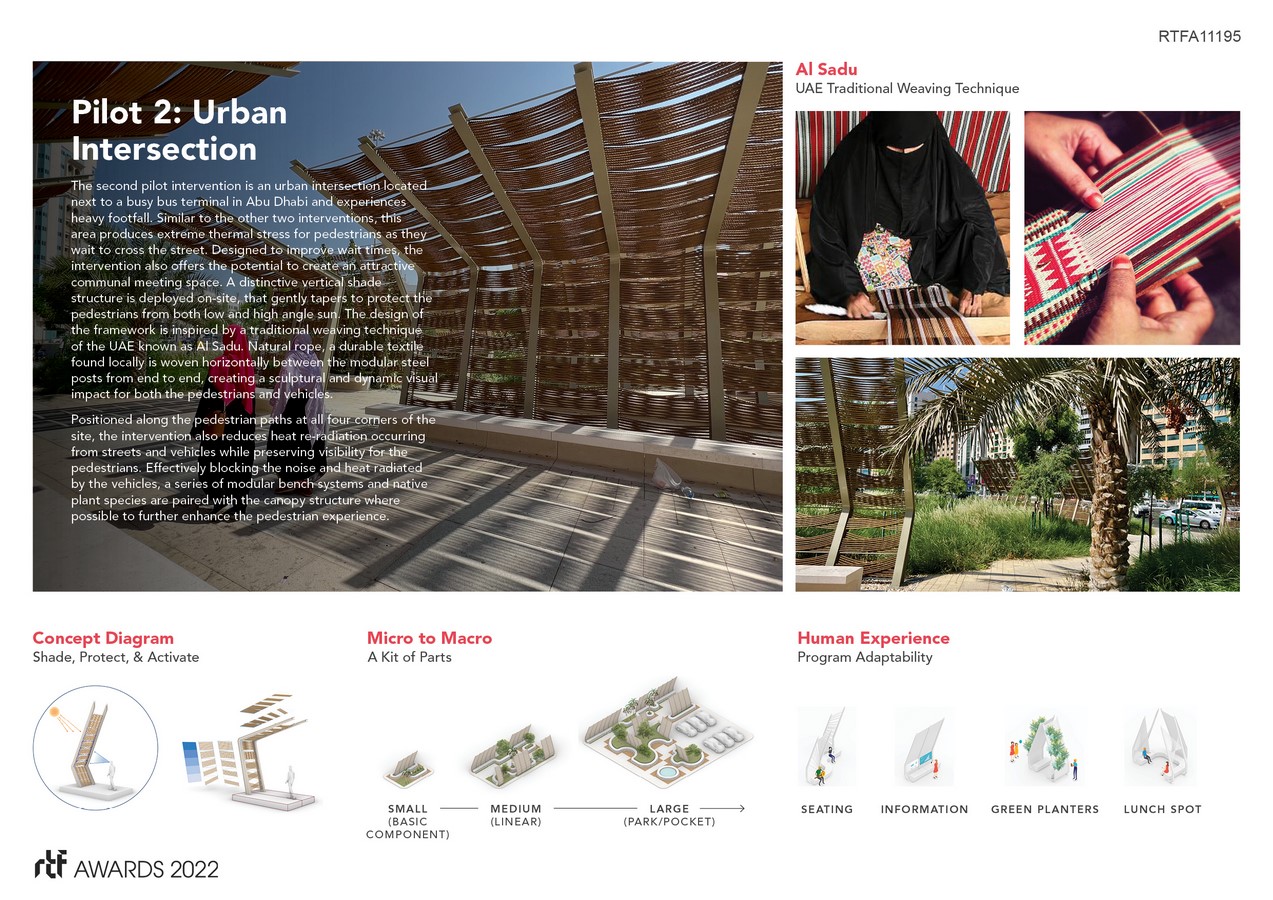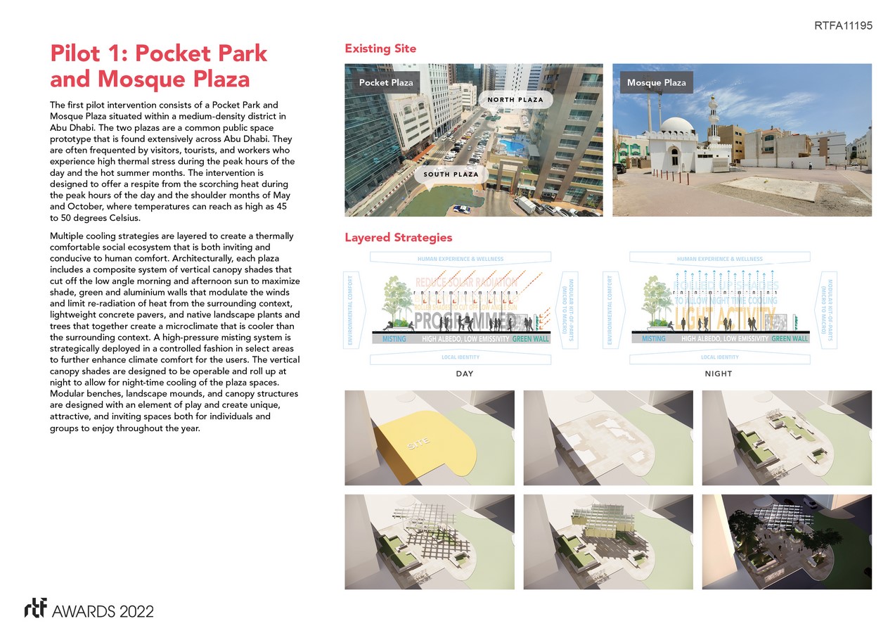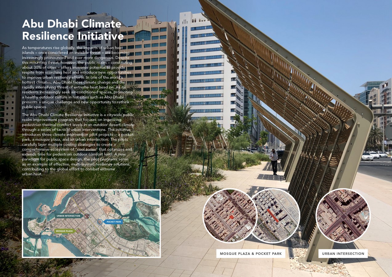 The Abu Dhabi Climate Resilience Initiative is a citywide public realm improvement program that focuses on improving pedestrian thermal comfort levels in an outdoor desert climate through a series of tactical urban interventions. The initiative leverages international collaborations between urban designers, climate scientists, engineers, and landscape architects to explore creative heat mitigation strategies in one of the hottest cities in the world. While climate change is a global challenge, the Initiative recognizes that effective heat mitigation solutions must be hyper-local and address specific regional needs. Employing climate science, extensive urban research, and rigorous testing, the Initiative deployed a combination of climate-sensitive strategies to effectively reduce urban heat island effect in an environmentally responsible way. The program implemented a series of pilot projects at three typological sites: pocket park, mosque plaza, and an urban intersection. Rather than introduce a one-size-fits-all solution, the pilots integrate multiple cooling strategies based on a careful analysis of each site.