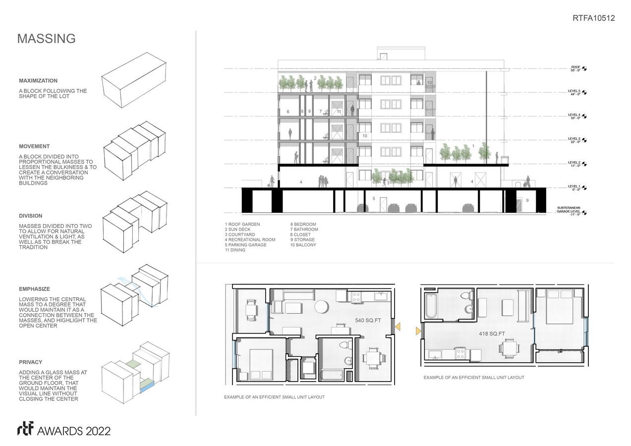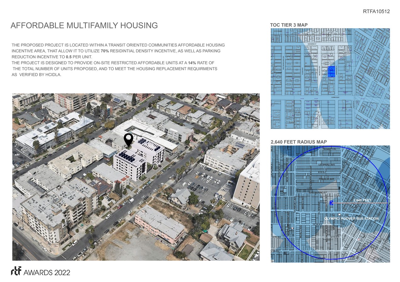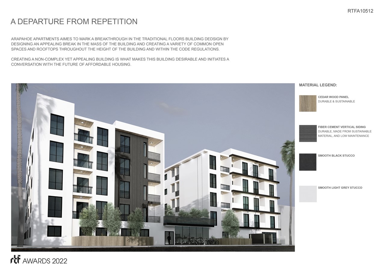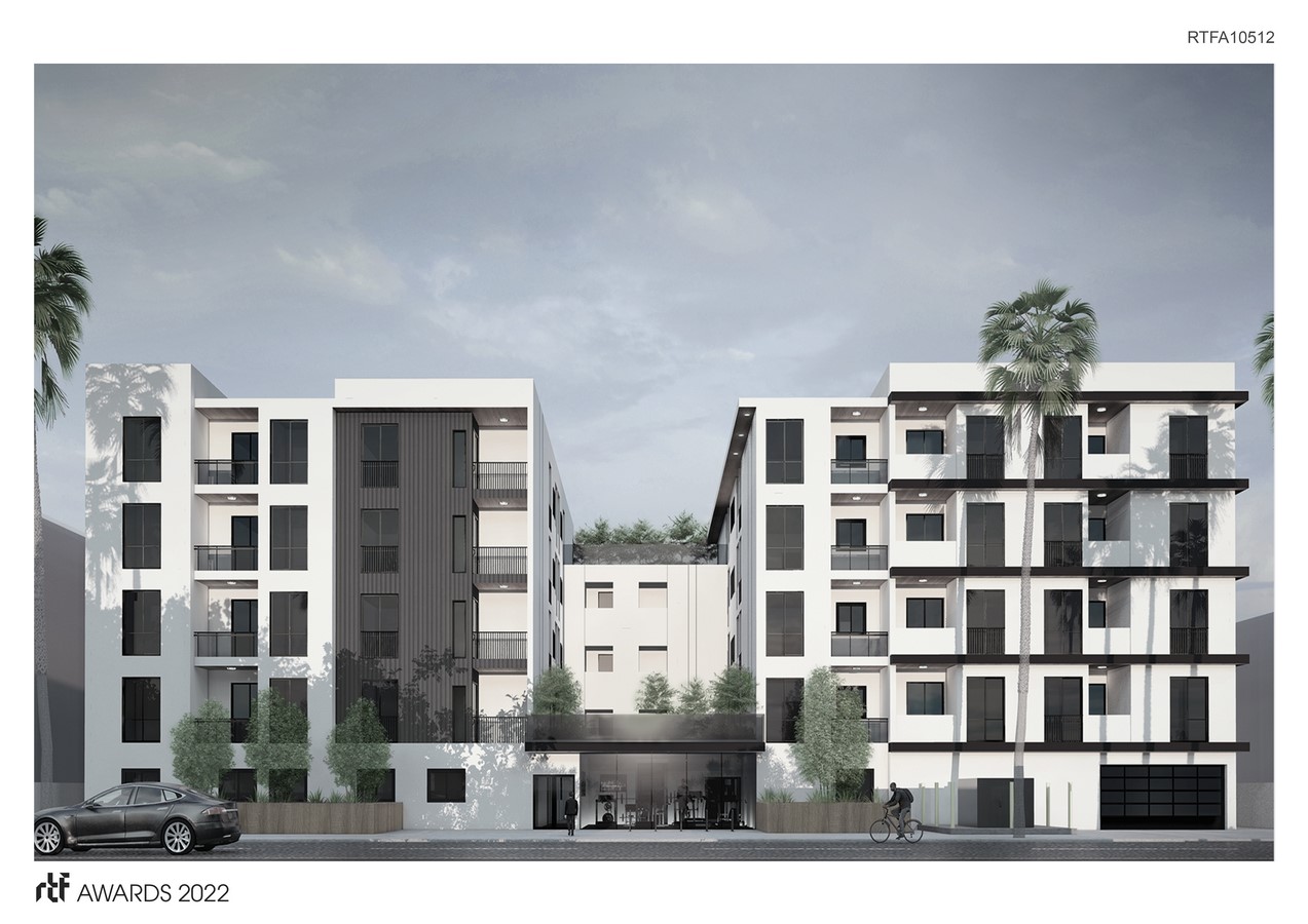 Within the neighborhood of Koreatown in Los Angeles, Arapahoe Apartments intend to support one of the most densely populated areas in the United States, with high poverty rates. One of the main design goals for the proposed affordable housing project is to generate positive spillover effects by creating a high-quality product dedicated to the comfort of inhabitants.
