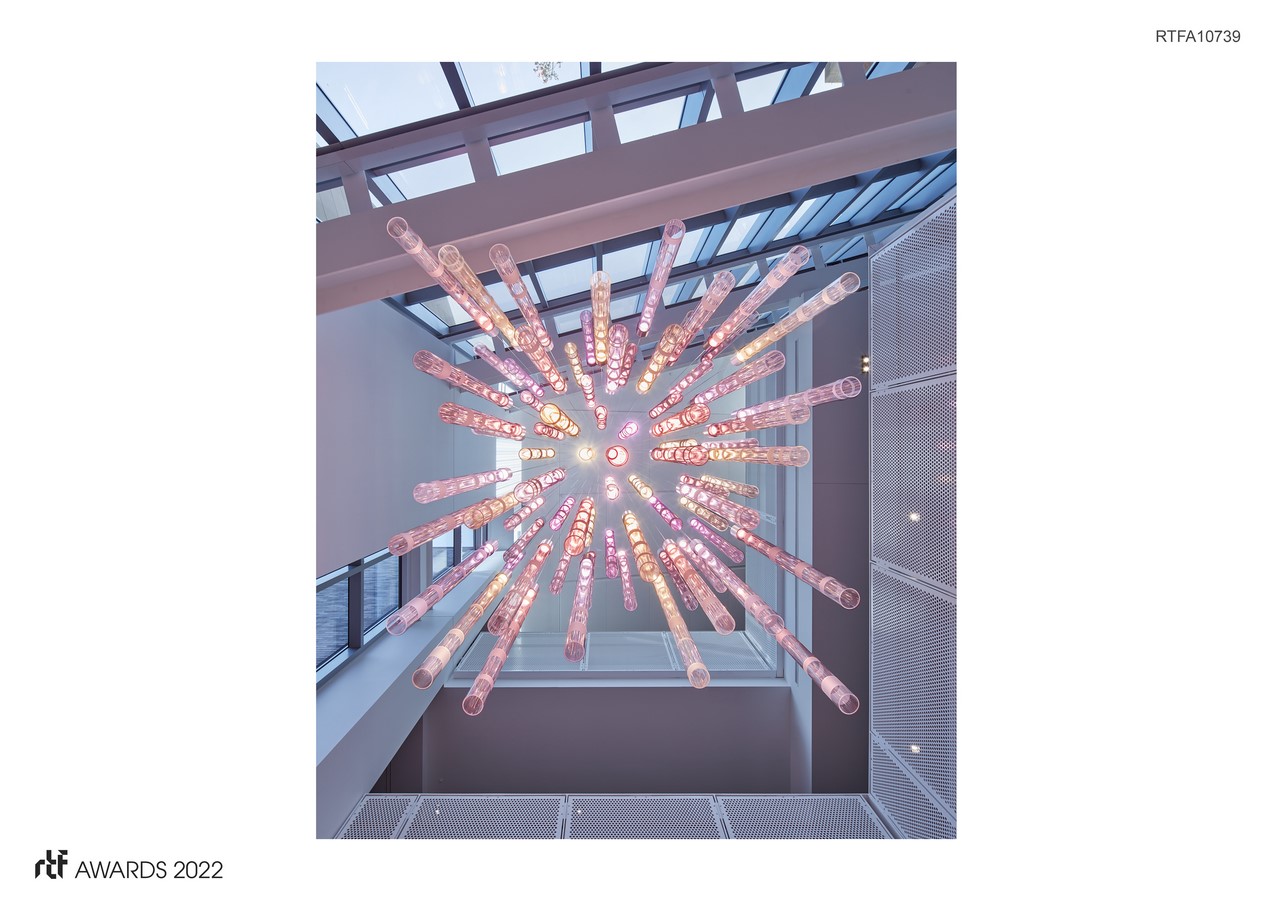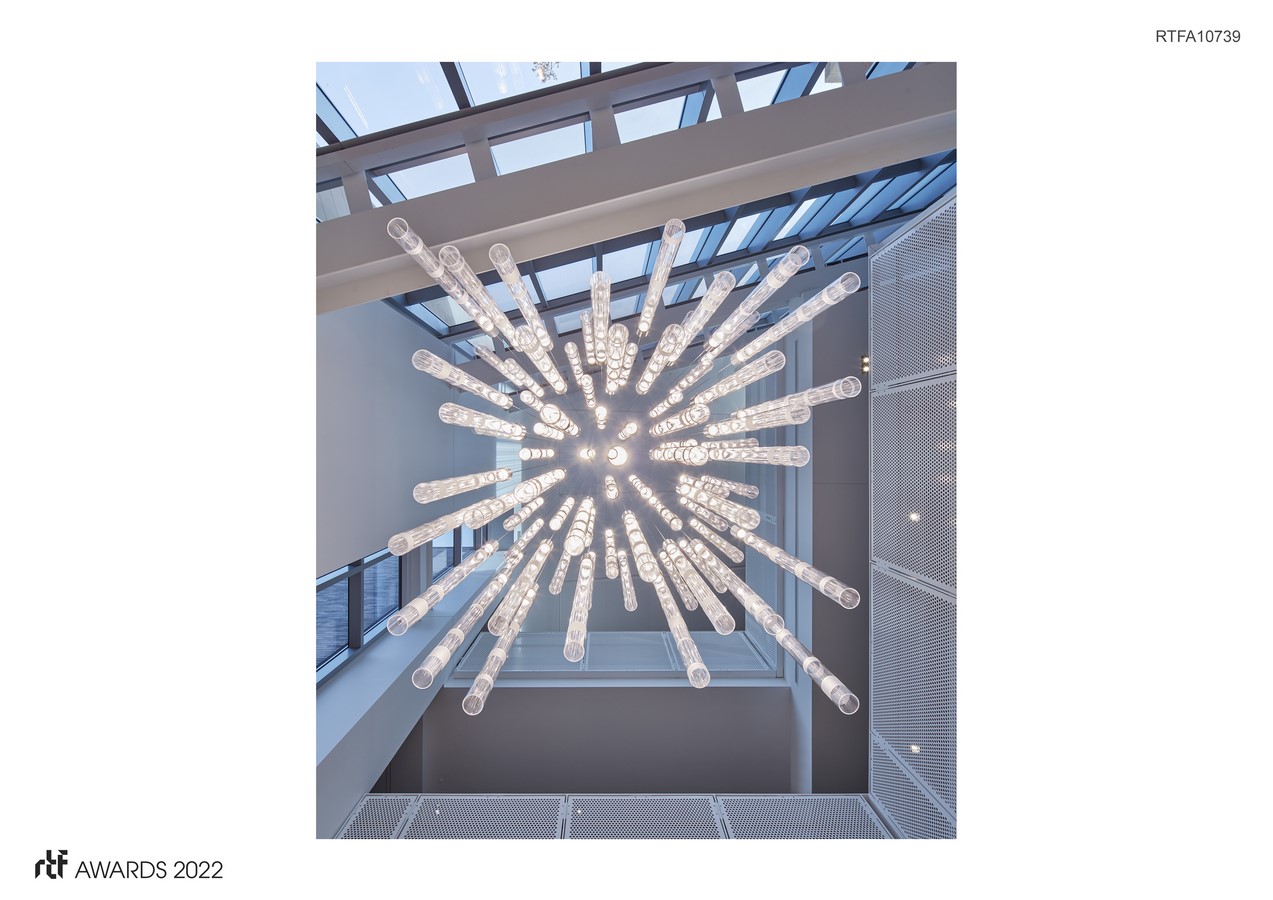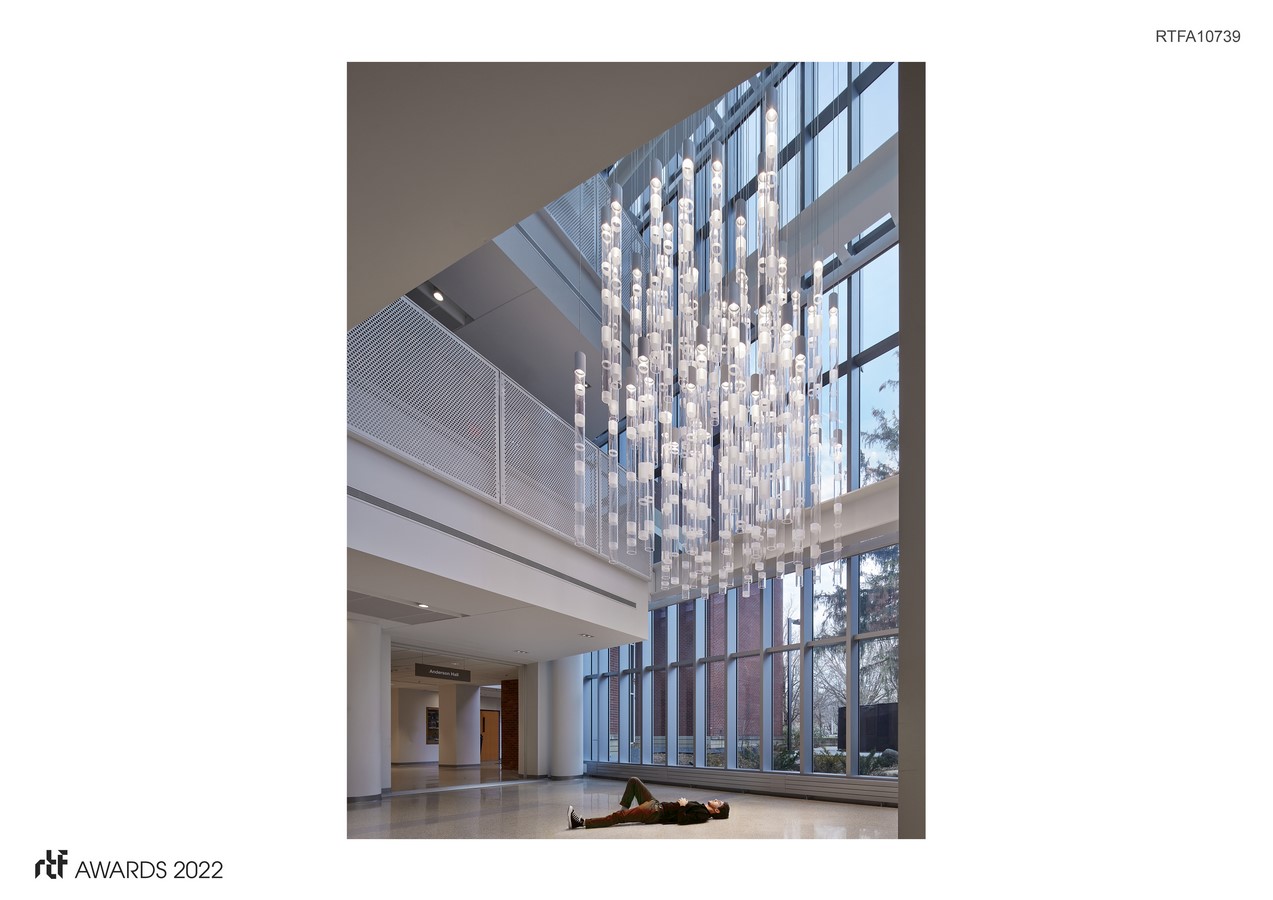 A new interior atrium between two science buildings provides a multi-level connection between classrooms, offices, and social spaces. As this major hub of activity overlooks the central green, the college wanted a light installation that would be a focal point from both inside and out, bringing forward art and science with an eye towards active engagement.