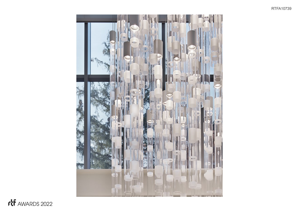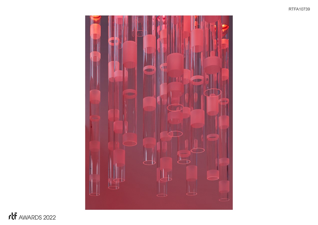 The sculptural form consists of almost 80 acrylic tubes, four inches in diameter and six feet long, hung in two overlapping tiers. The random array forms an eight-foot square in plan and is about 11 feet in height, hanging from the sloping ceiling by power cables. Each cylinder cap holds a LED ring that sends light through the transparent areas, creating a colored glow only at the translucent bands and the bottom surface of the tubes.