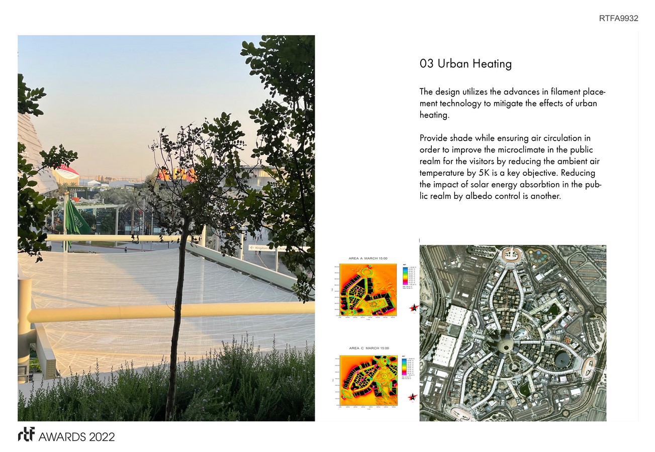 During the Expo 2020 Dubai® Event, the Shade Structure and Shade Canopy (the Shade Structure) will connect all spaces within the public realm, providing a structure that is architecturally distinct while offering a pleasant microclimate for all visitors to the venue. The design solution for the Shade Structure had to be an innovative solution which will complement the landscaping and natural vegetation. This shall be done in a way that helps develop the Legacy vision of the site.