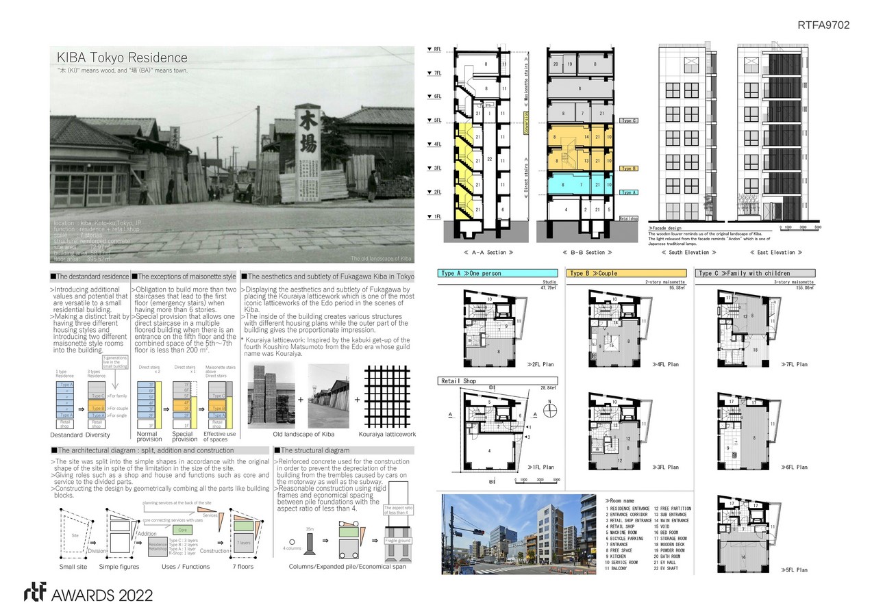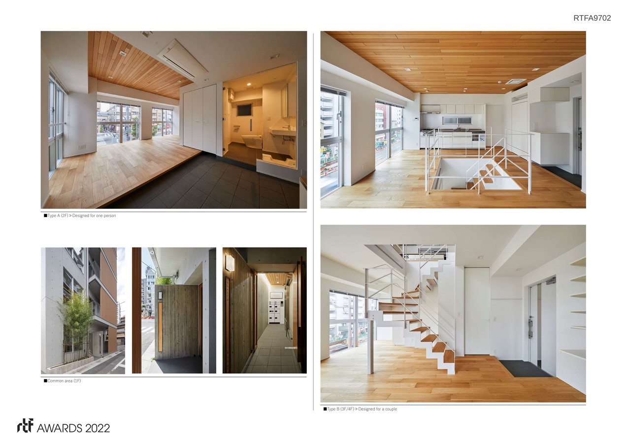 In order to adapt the various lifestyles of the city as well as maximize the potential of the small building, we designed the structure with multiple spaces based on the lifestyle despite the strict restrictions given by the size of the site. Therefore, we accomplished to have three different types of housings, namely a residence for one person (Type A), a couple (Type B) and a family with children (Type C) in a single building. Even though the size of the building is small, the different types of housings are being together, therefore constructed the fine community of a residence in a city.
