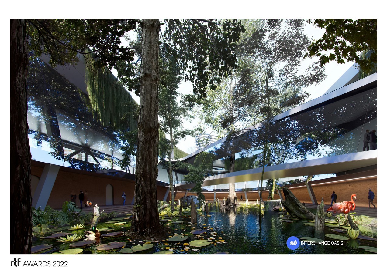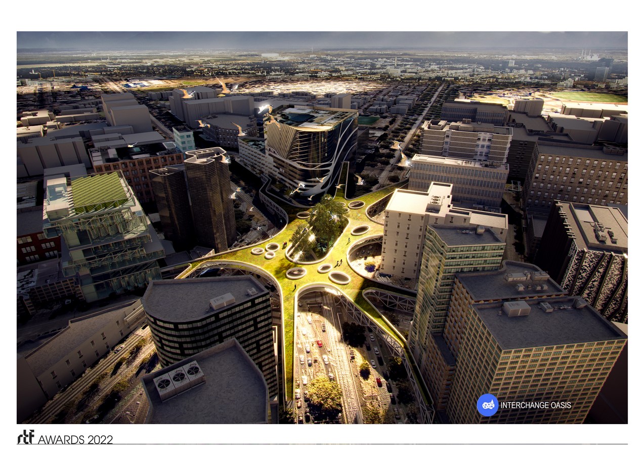 Sponge City integrates water management into urban landscapes that includes storage, recycling, re-use, adaptation and protection. Interchange Oasis exemplifies how flash floods from a covered-up urban creek can be diverted to offer spaces of respite for surrounding hospital users. Their water greens facades and roofs of an overpass with amenities.