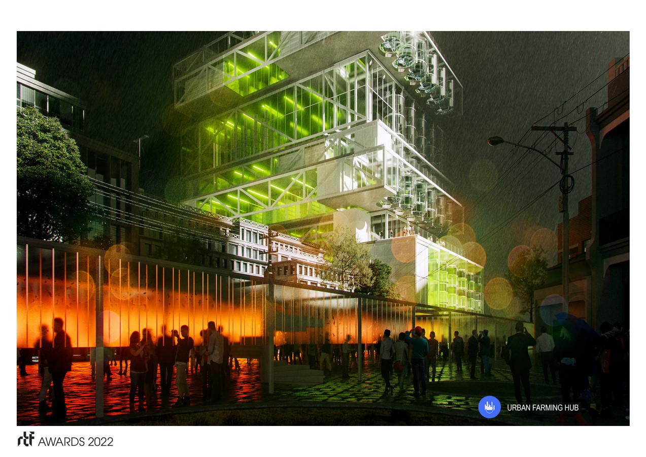 Self-sustained City elevates local food production exploring urban farming through industrialised forms, roof retrofits, and reusing streets for community farming as exemplified in the proposed Urban Farming Hub