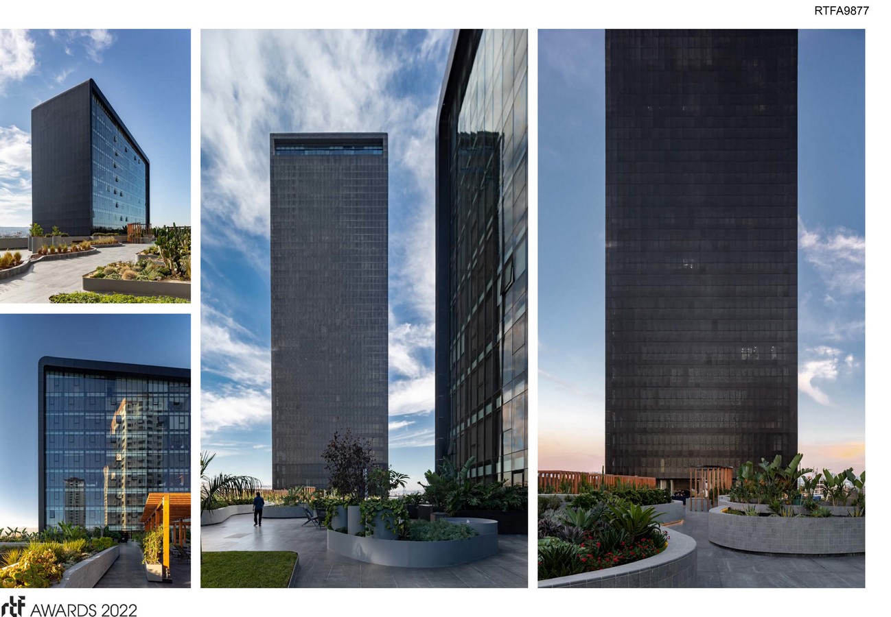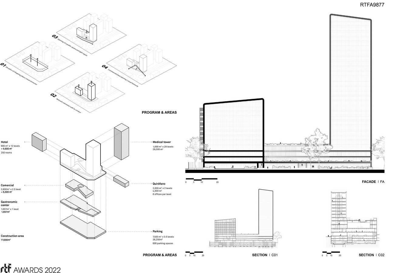 The difference in the uses of the architectural program volumetrically creates two displaced towers on the same axis and in opposite locations on the land that are linked by a central body that houses the public use areas and the commercial plaza. The volumetry was the response to the complex variables involved in the design of a building with so many different uses, hospital logistics dictates different specifications at the structural level, as well as the entry mechanisms and the management of hospital waste and waste, all these conditions They were able to be solved without altering the architectural language, physically separating this area from the rest of the complex.