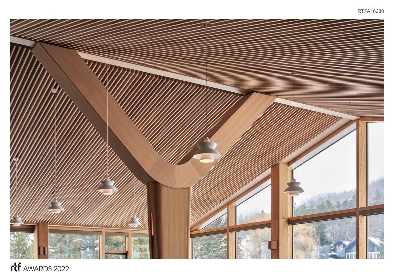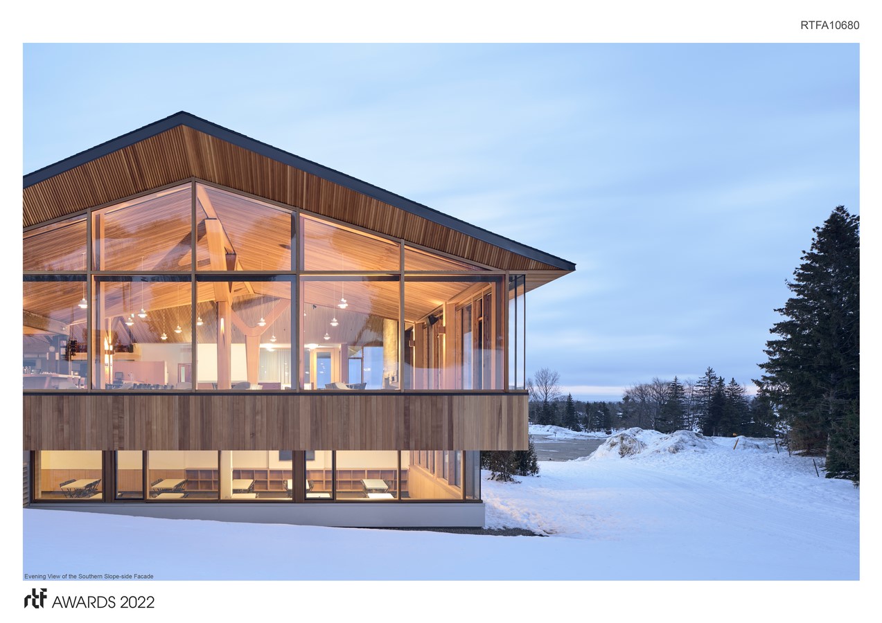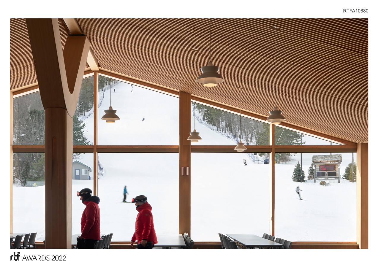 The Osler Bluff Ski Club is a project that reuses, restores, and expands an existing 1970’s ski lodge into a modern, energy-efficient building that celebrates traditional timber construction and the joy of winter sport. The design renovates the existing lodge and adds a new bay to the pleated-roof structure. The addition extends the main-level dining room, housing childcare and auxiliary spaces below. It foregrounds a dramatic pair of Y-shaped wood-and-steel columns—a contemporary version of the heavy timber columns of the original structure.