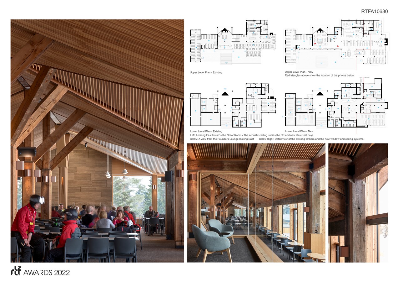 The decision to reuse and extend the existing Clubhouse was strategically about repurposing the existing building rather than discarding and building new. The entire structure was conserved, with most of the timber columns left in place, and others relocated to a new lounge that looks out to the ski hill on one side, and over the dining room to the other.