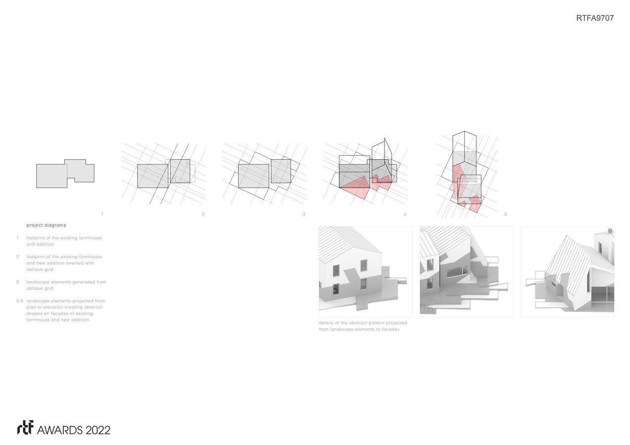 The new proposal is a turn back outward, but rather than turning toward the city it turns out to a different aesthetic for the country on its own terms. The 1960s kitchen addition has been replaced by a new structure that plays on expectations of typical farmhouse typology. Its mass is rotated 90 degrees and organized on an oblique grid, its roof ridge is broken and placed off-center, part of its roof is ‘too steep’, and the new entrance is ‘too low’. Spaces in plan are organized on an oblique grid rotated with respect to the original house and street. Shapes are projected from the plan of new landscape elements up onto facades of the existing and new structures. These projected shapes become a type of abstract ornament that draws attention, but unlike traditional ornament intended to reinforce ordering of the building, these shapes work against the existing order. The intention is to introduce a strangeness from elsewhere that works against a traditional ‘house in the country’ aesthetic.