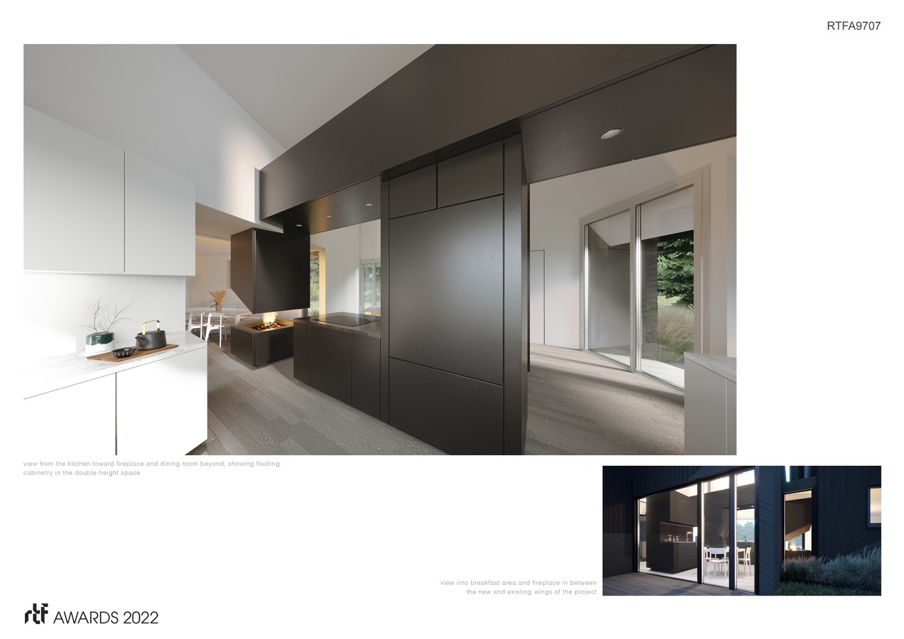 Projected shapes on the façade are made with different textures of blackened wood siding installed at different angles. The new kitchen wing is a single large, high ceiling space with floating millwork elements that define spaces for the kitchen, breakfast area, and entry vestibule, as well as provide storage. A fireplace is situated in the link between existing and new wings of the house, creating a focal point that draws the two separate parts of the house together.