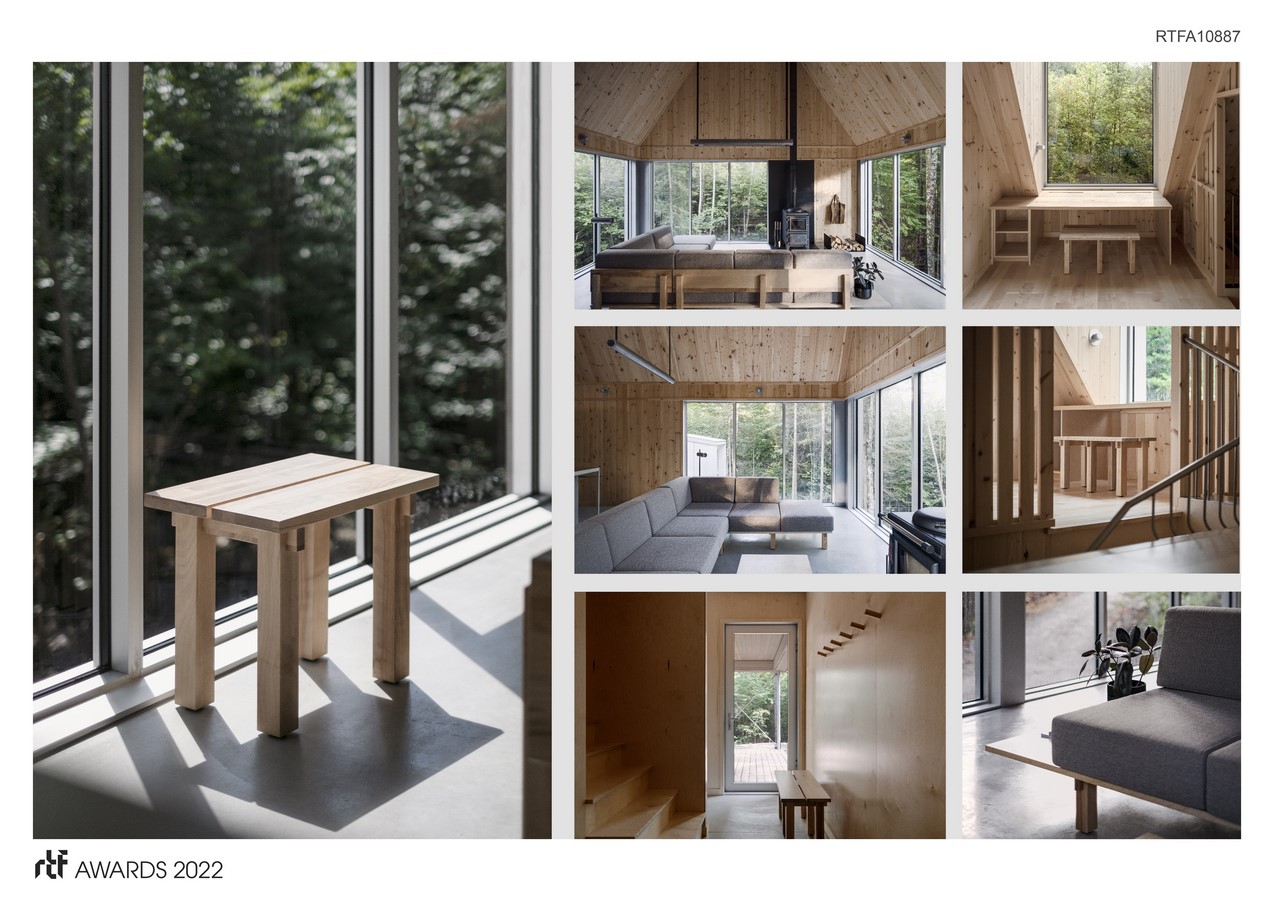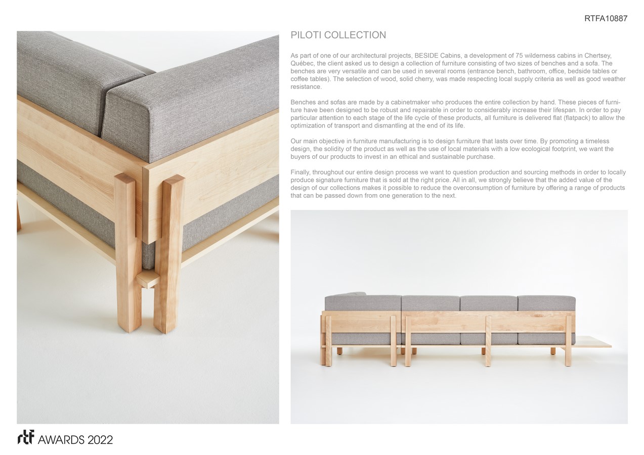 As part of one of our architectural projects, BESIDE Cabins, a development of 75 wilderness cabins in Chertsey, Québec, the client asked us to design a collection of furniture consisting of two sizes of benches and a sofa. The benches are very versatile and can be used in several rooms (entrance bench, bathroom, office, bedside tables or coffee tables). The selection of wood, solid cherry, was made respecting local supply criteria as well as good weather resistance.