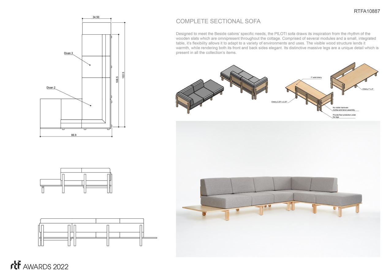 Designed to meet the client’s specific needs, the PILOTI sofa draws its inspiration from the rhythm of the wooden slats which are omnipresent throughout the cottage. Comprised of several modules and a small, integrated table, its flexibility allows it to adapt to a variety of environments and uses. The visible wood structure lends it warmth, while rendering both its front and back sides elegant. Its distinctive massive legs are a unique detail which is present in all the collection’s items.