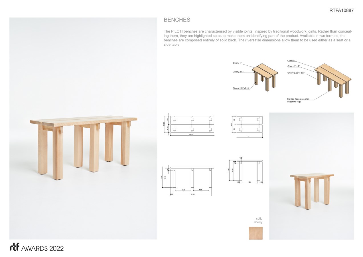 In the same spirit, the PILOTI benches are characterised by visible joints, inspired by traditional woodwork joints. Rather than concealing them, they are highlighted so as to make them an identifying part of the product. Available in two formats, the benches are composed entirely of solid birch. Their versatile dimensions allow them to be used either as a seat or a side table.
