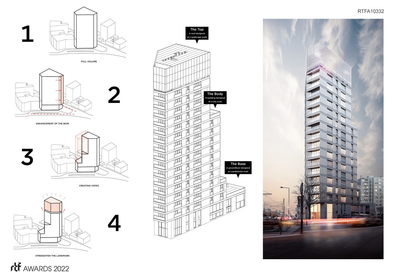 The volume of the TESE tower is the result of the extrusion of the parcel into its maximum size, the shape of the land giving its form to the new building. The choice of advancing this volume to its thinnest slice allows to represent the bow of the building. The volume is cut from the bottom to the top from its south-east part in order to create great views on the city and generate outdoor spaces.
