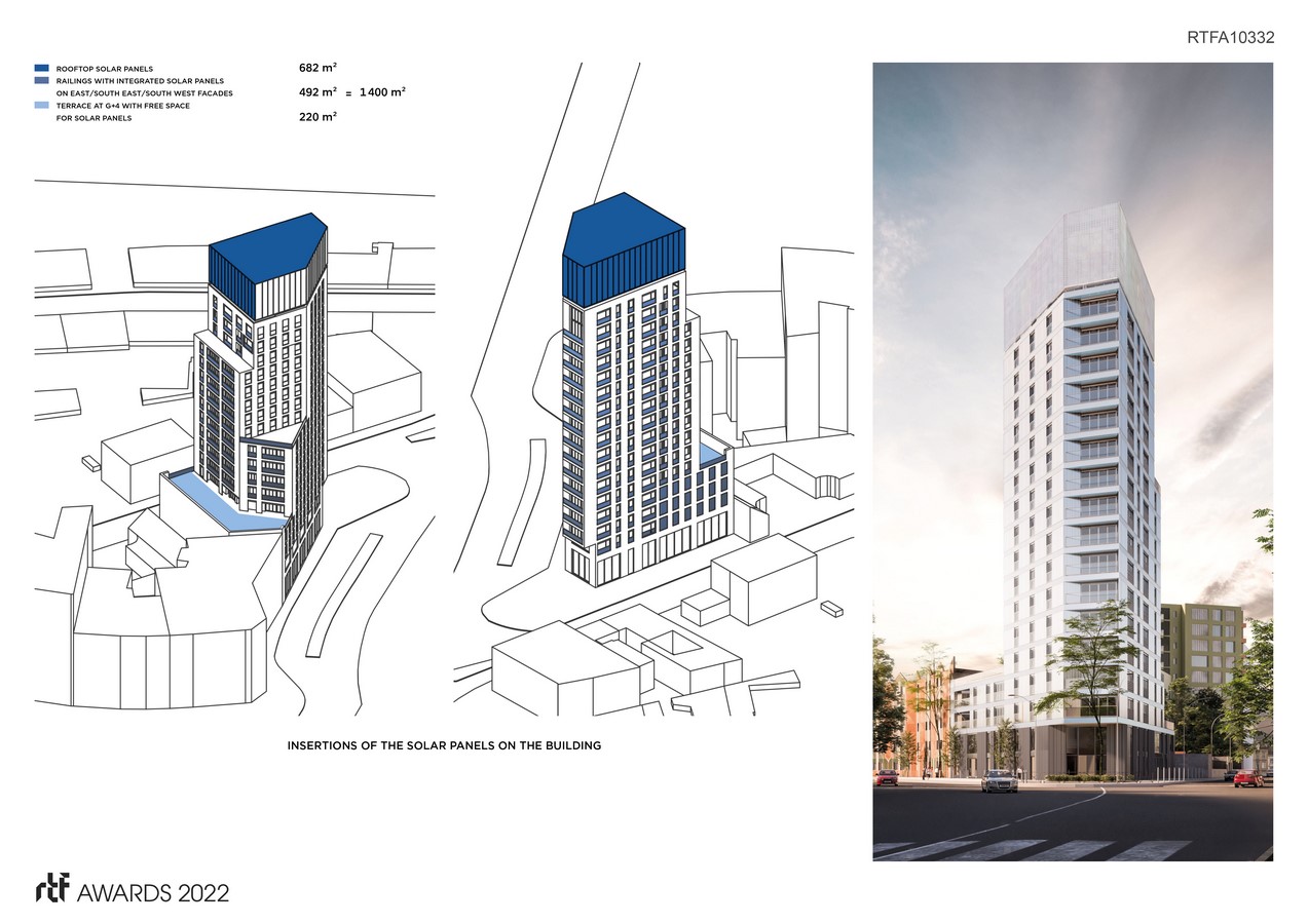 The ambition of this project is to propose a positive energy balance and to allow users to have an energy consumption bill of 0โฌ. This is possible thanks to the installation of technical equipment, in particular 1400 mยฒ of photovoltaic panels on the faรงade and roof. The building also features rainwater reuse and a hybrid “triple flow” ventilation system.