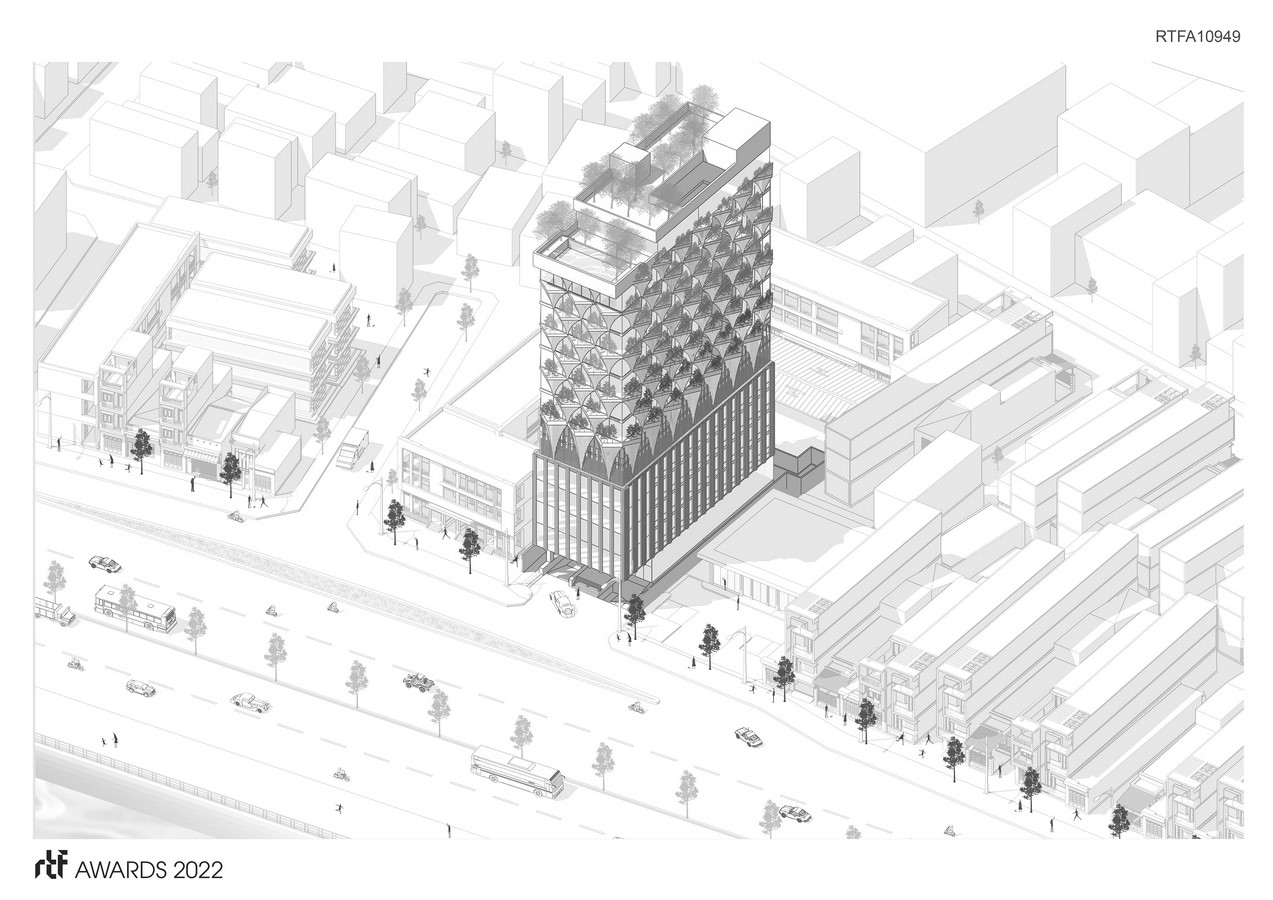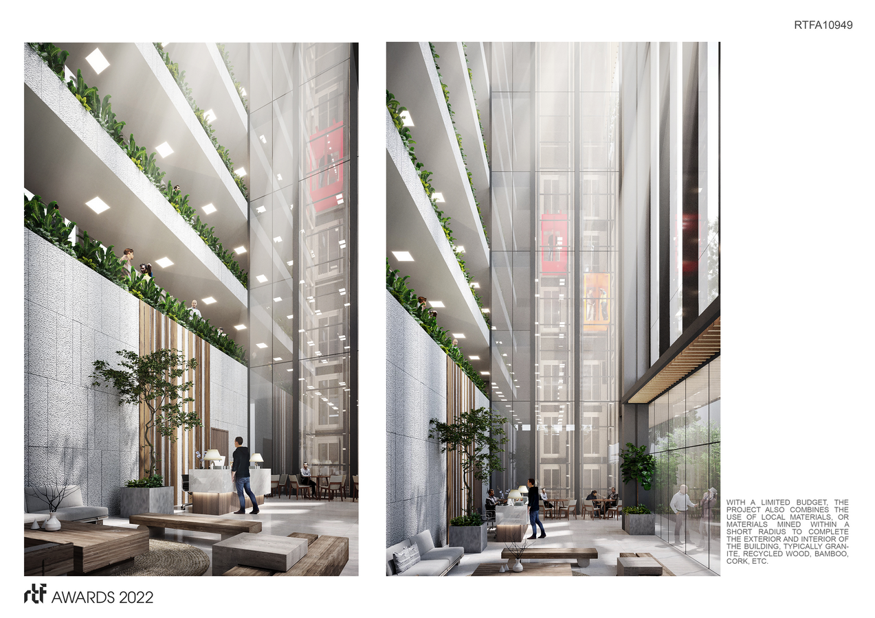 A + Architects’ solution is to turn the hotel’s balconies into green branches that create a striking identity for the building. In addition, the combination of solid and closed arrays (scaled in the direction of the sun) from the 2nd to the 6th floor also helps limit radiation according to the solar angle and reduces costs compared to using all glass.