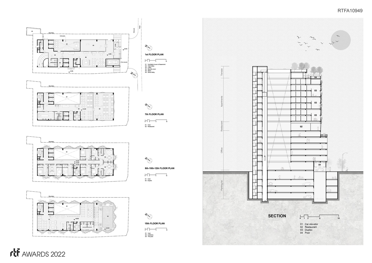 The project is a 19-story block consisting of 15 floors and 4 basements, the 1st floor is a combined office space, the 2nd to 5th floors are offices, the 6th floor is a shared office space (coworking), The 7th floor is the restaurant, cafe, and technical area, the 8-14th floor is the serviced apartment area. In particular, the project’s large potted plants are located on the 6th floor and the swimming pool space is located on the 15th floor.