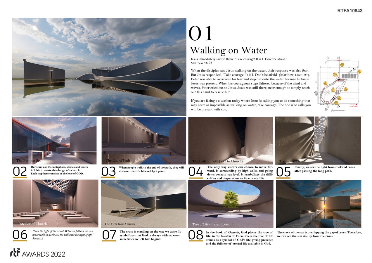 Each step here consists of the stories, verses, metaphors, and wisdom Jesus told us in bible. Each step is part of the process to establish the faith in God when we approaching to the church. This Building consists of worship area, prayers area, training area, outdoor square and the spaces for Christians family and children to stay and play. There are several bed rooms and restaurant with the sea view. It’s designed for Christian and their families’ needs. Hope you like this concept. Jesus loves you.