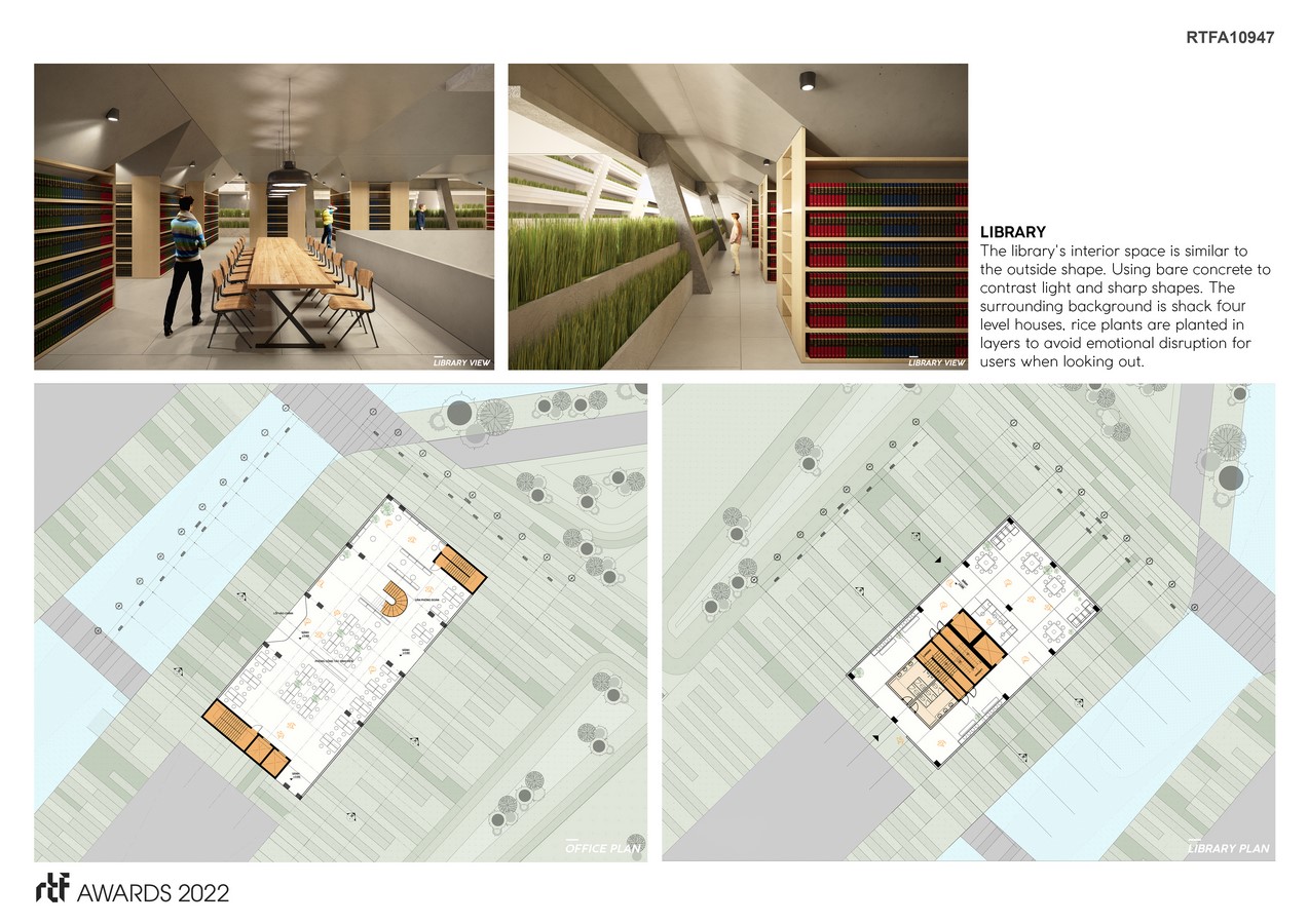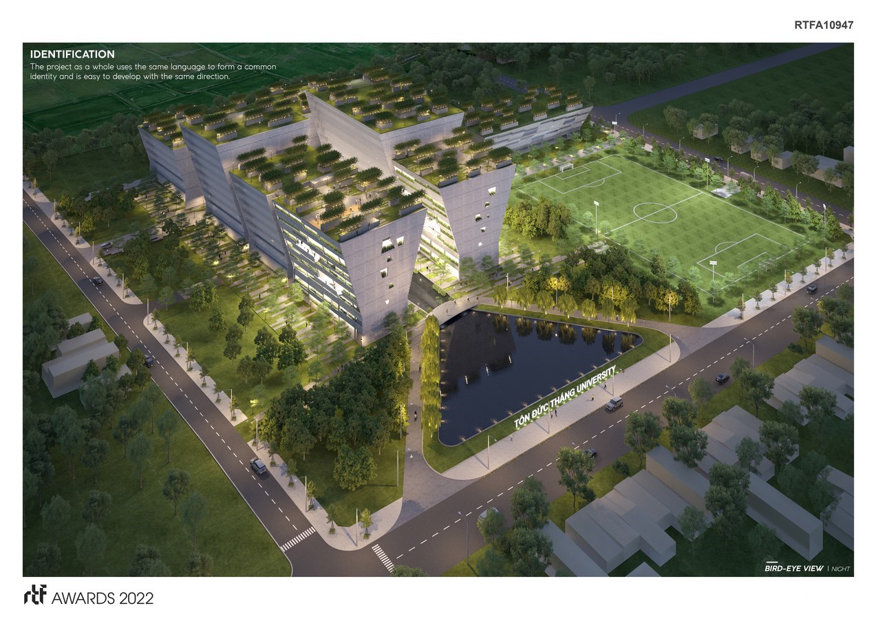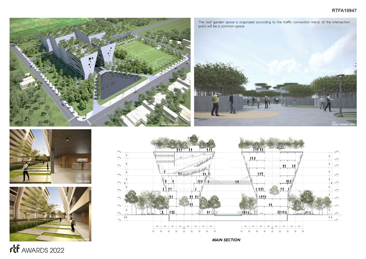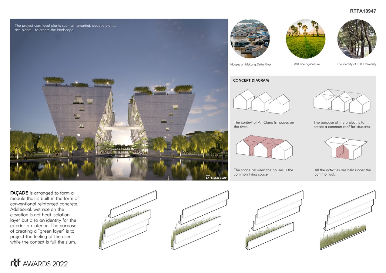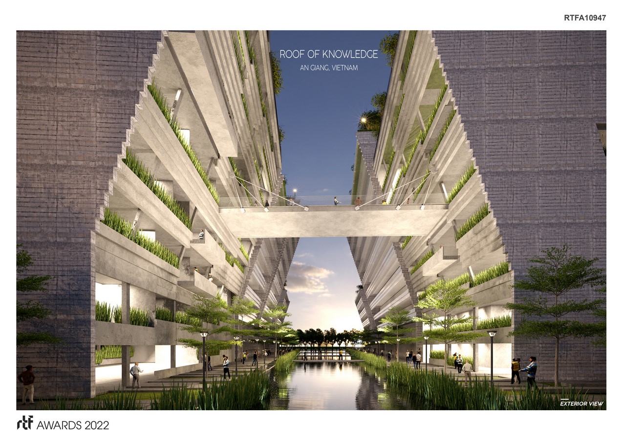 In an area with five hectares, the design mission is to create a roof of knowledge between two sides of buildings. It is not only a symbol of an invisible house on the water with the rice fields being behind but also an opening heart to receive the knowledge image, every activity is taken place under the “roof of knowledge”. The continuity of context, landscape, water surface creates the flow for the project. In terms of buildings, each block of building uses the resemblance rhythm which is harmony in general when they want to extend the school. The inspiration from the identity of An Giang is presented not only on the ground but also on the vertical surface. The development of the country has witnessed by urbanization with the appearance of a lot of modern buildings. Therefore, sustainability has emerged as a topic of interest and the purpose of creating a sustainable university is to decrease either the concretization or pressure on the environment. Landscape plays an important role in planning and architecture, it helps the users to control their feeling, protect entire the campus by green coverage.