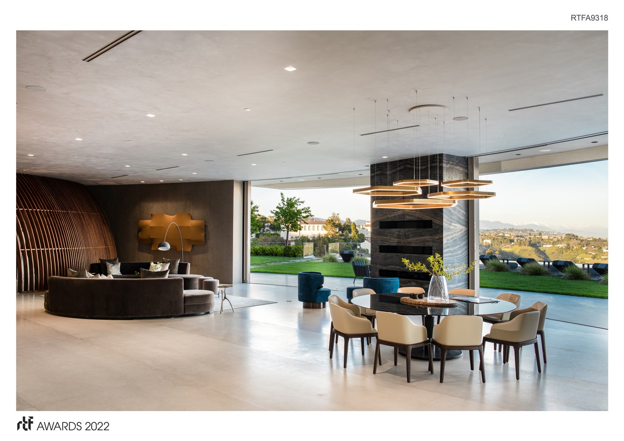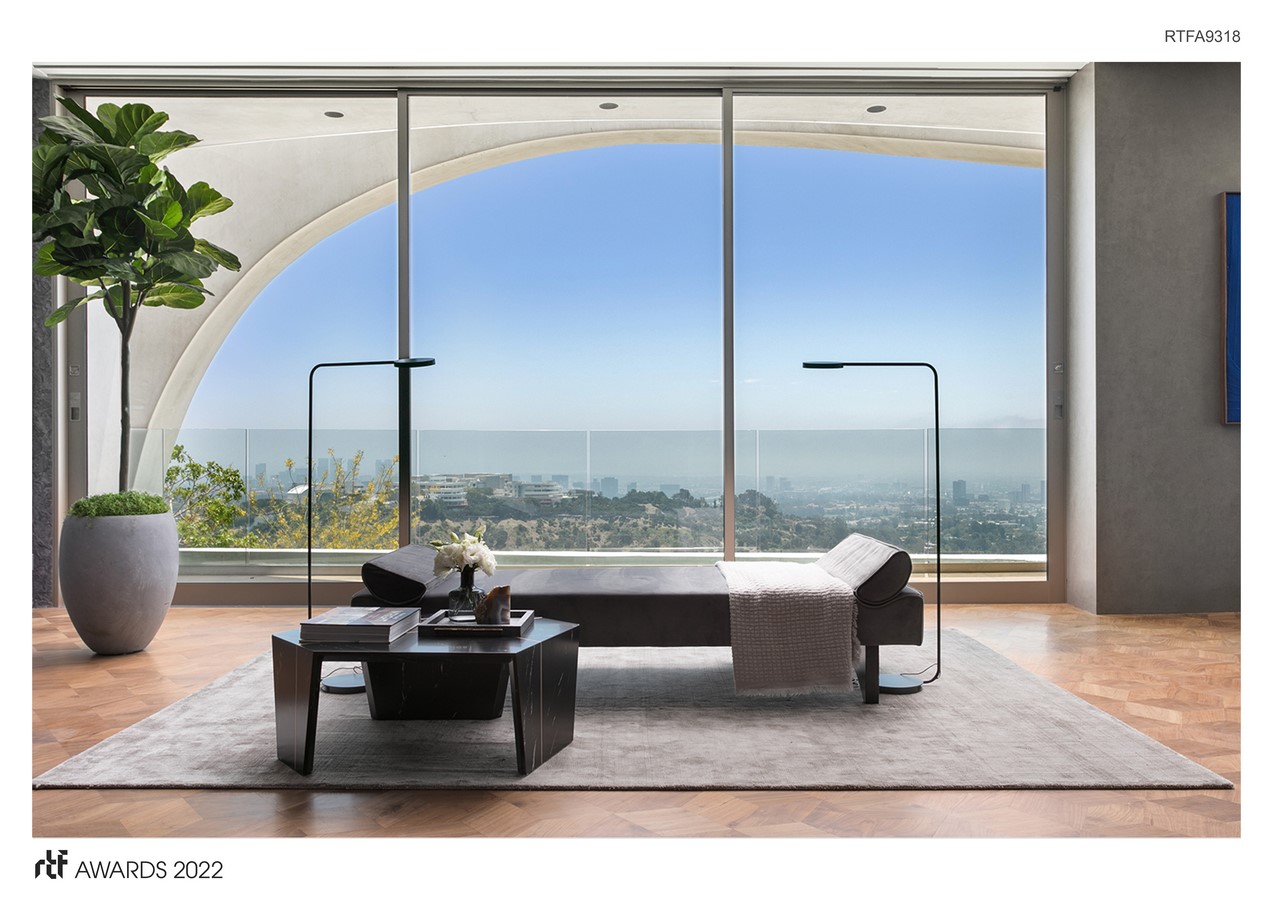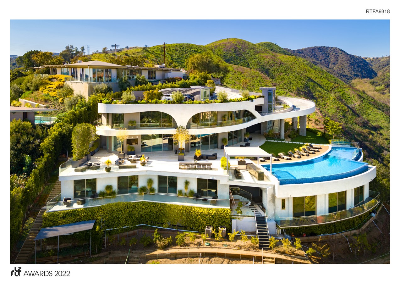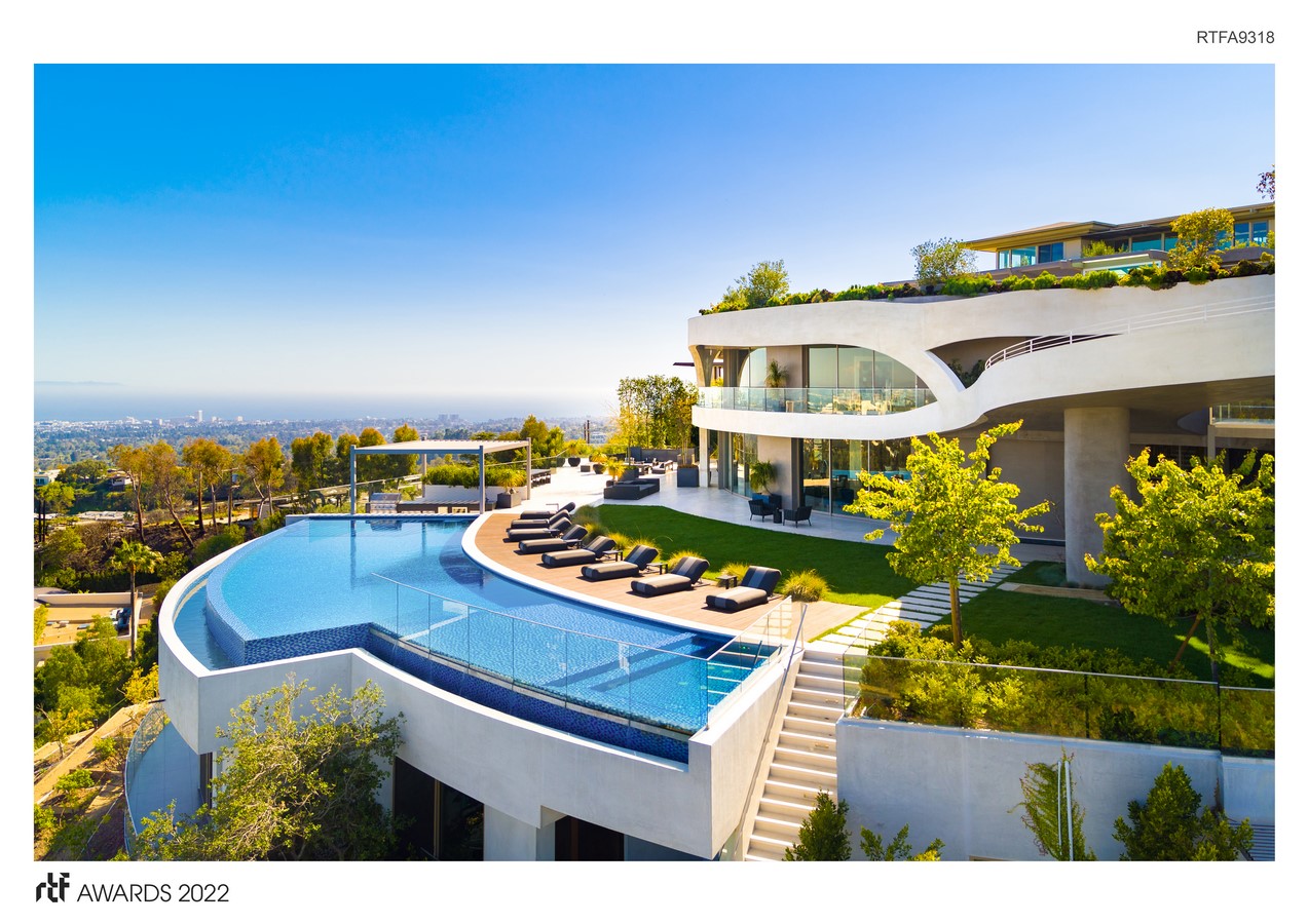 Sky Lane is a state-of-the-art, 17,000 square feet modern hillside residence with breathtaking views of Los Angeles and the Pacific ocean. Located in West Los Angeles alongside remarkable architectural projects like The Getty Center, the curved design of Sky Lane follows the natural curvature provided by the steep hillside of the Brentwood hills.