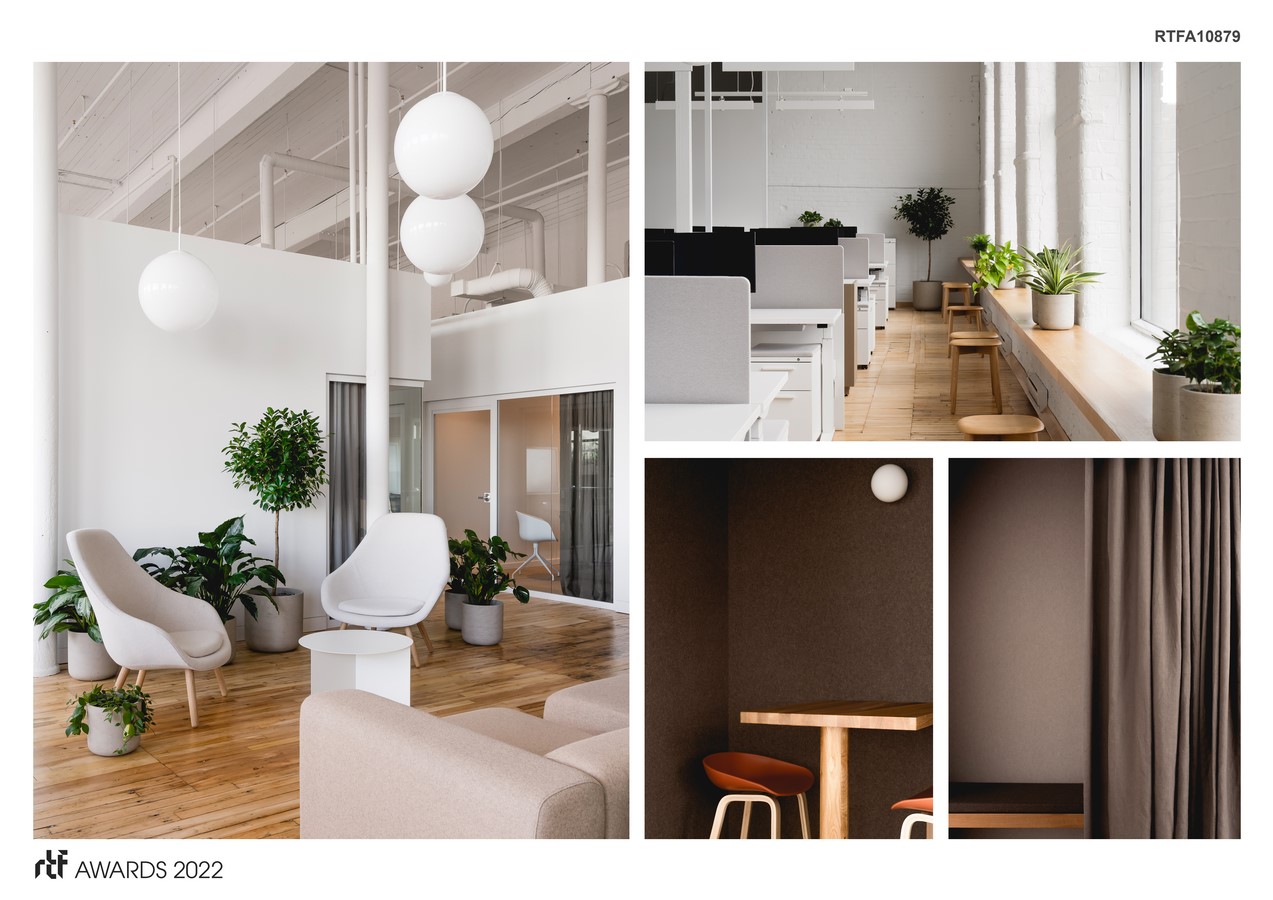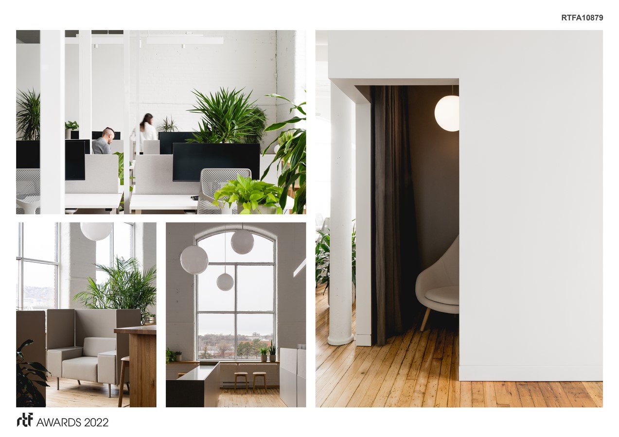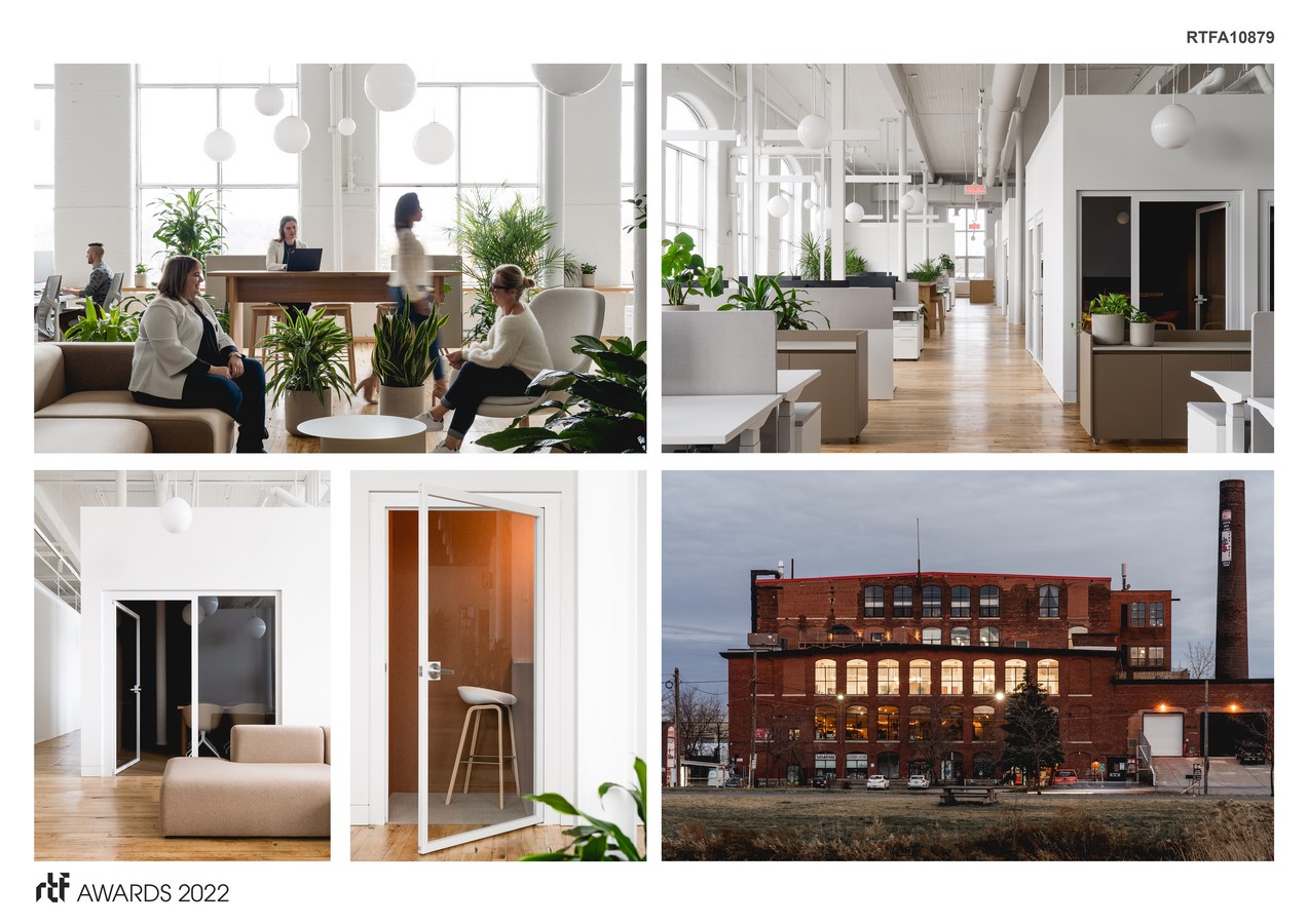 The project occupies a space within a 1908 industrial building complex overlooking the Lachine Canal in Montreal. The plan highlights the intrinsic qualities of the century-old construction and takes advantage of the high ceilings and large openings. The offices are set up on the window side, while all meeting rooms still benefit from a generous supply of natural light. The design reveals the original brick walls, mill floor and wood structure. The closed rooms are lined with felt, rugs and curtains in warmer and darker colors, providing an environment conducive to concentration. The sober yet warm design gives the project a signature both human and professional.