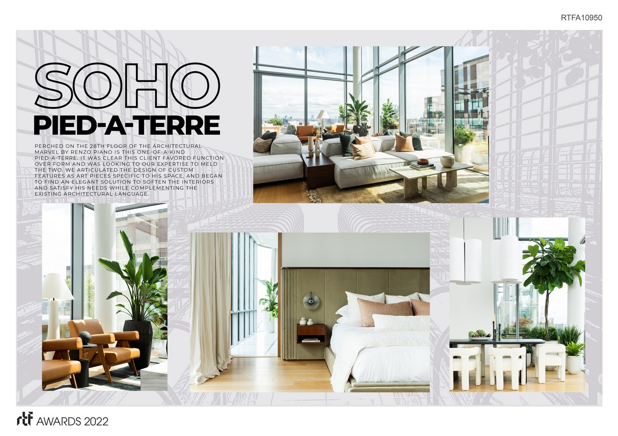 When referred to a pragmatic client who spends his days on Wall Street to design his Pied-A-Terre in a highly distinguished architectural building by Renzo Piano, we swiftly took the opportunity weary of its challenges.