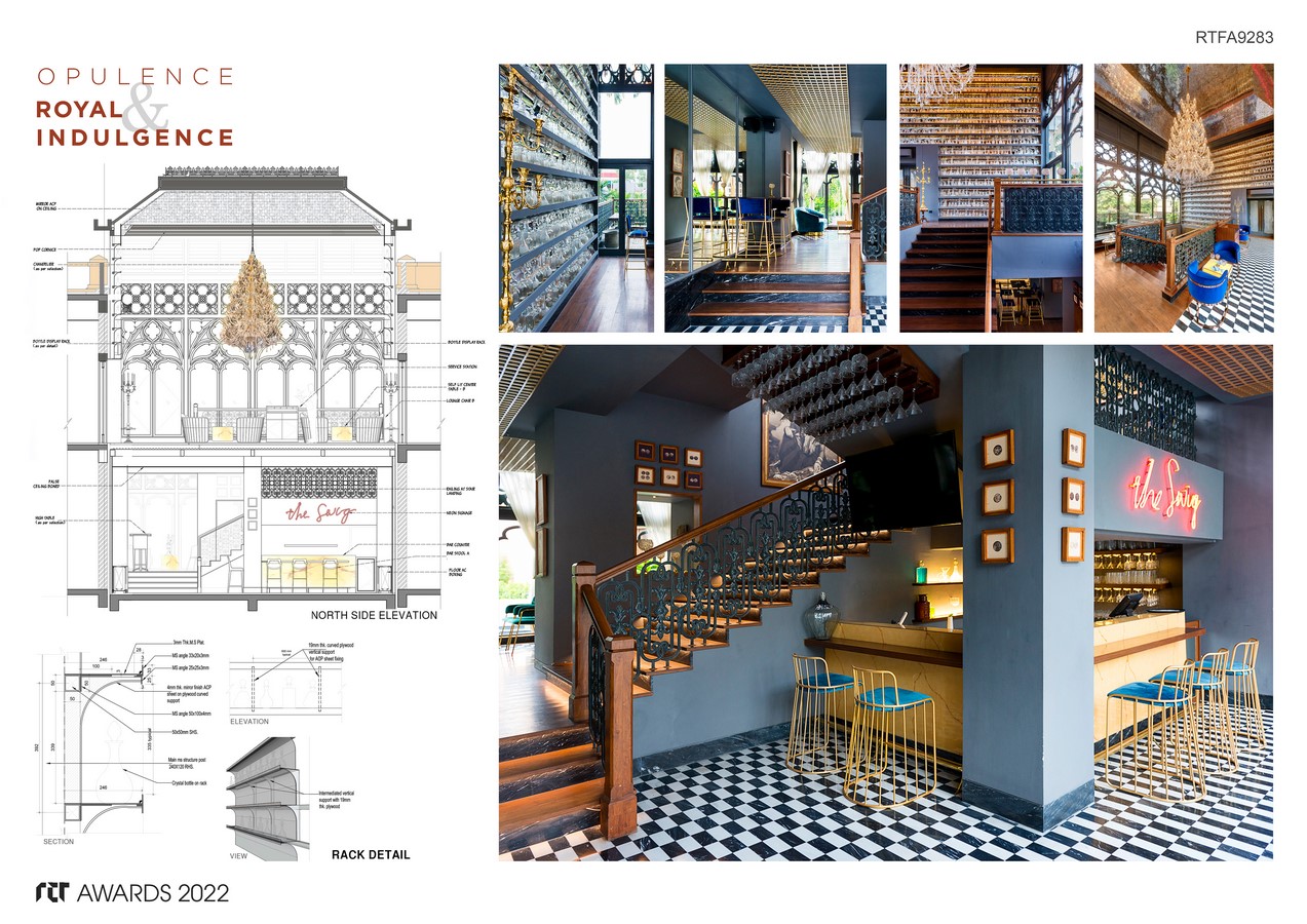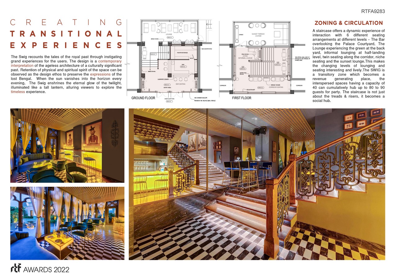 A staircase offers a dynamic experience of interaction with 6 different seating arrangements at different levels – The Bar overlooking the Palace Courtyard, The Lounge experiencing the green at the back yard, informal lounging at half-landing level, twin seating along the corridor, niche seating and the sunset lounge.This makes the changing levels of lounging and seating interesting and lively.The SWIG is a transitory zone which becomes a revenue generating place, the interspersed spaces having a capacity of 40 can cumulatively hub up to 80 to 90 guests for party. The staircase is not just about the treads & risers, it becomes a social hub.