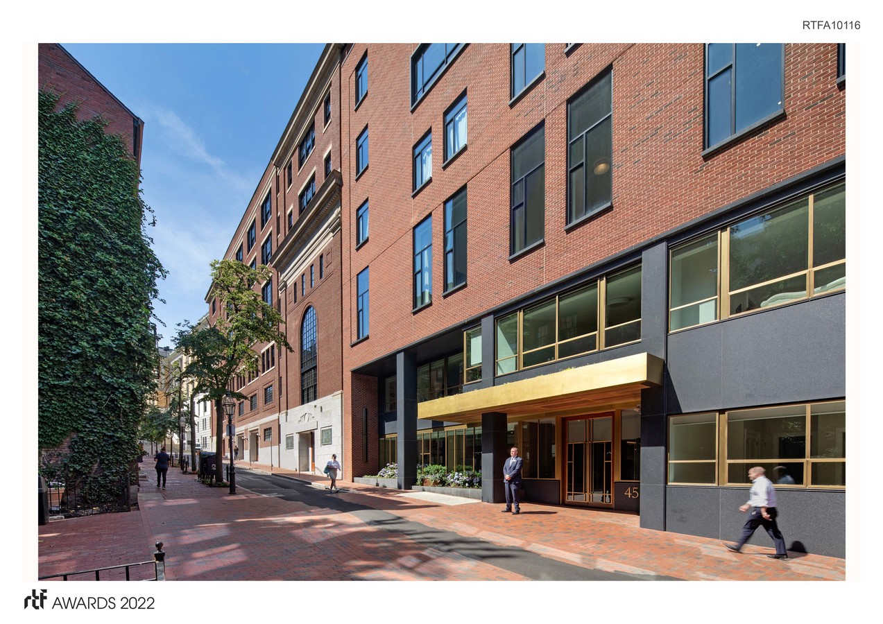 The Donahue building – constructed in the 1960s to house a new law library, classrooms, and lecture space – strikes a compelling aesthetic balance with The Archer building. The new design strengthens The Donahue’s original Modernist statement while improving the response to the historic neighborhood context. The original brick façade was replaced with new cladding in a historically contextual palette of red brick and granite. At ground level, bronzed storefront windows with smooth granite surrounds and columns generate an inviting presence along the alley-like Temple Street, and offer a complementary juxtaposition to the rough stone apse of an adjacent church. Higher up, a new line of horizontal ribbon windows on the fifth and sixth floors form a visual cornice line at the fourth story, creating a better alignment with the adjacent low-rise historic buildings on either side of the street. Individual materials were selected for their sustainability and long product lifecycle as well as their appropriateness to the surrounding Beacon Hill architecture.