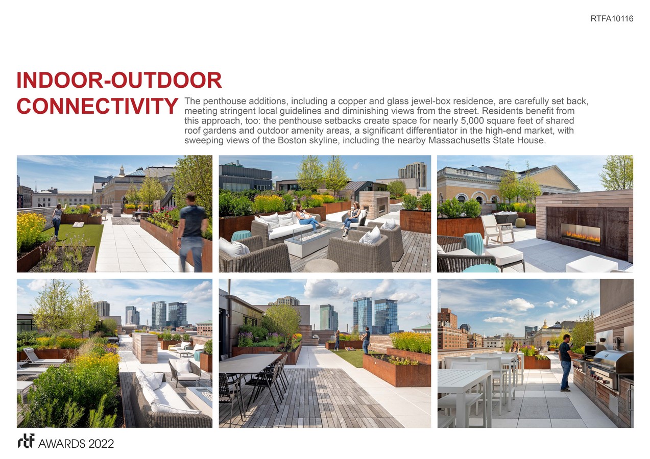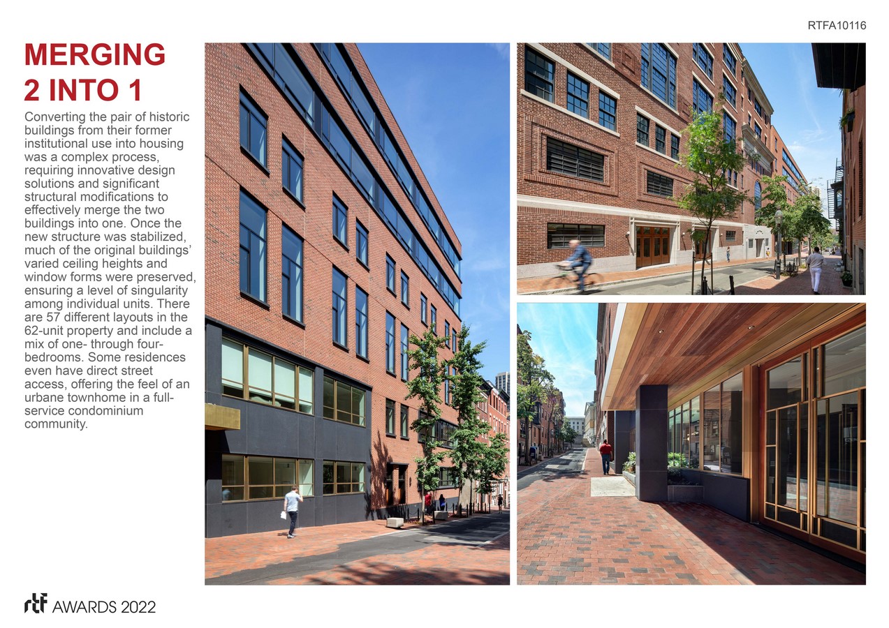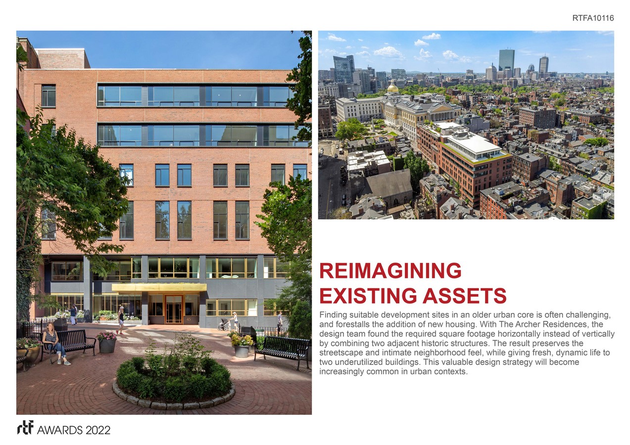 The Archer Residences, a 62-unit condominium building in Boston’s historic Beacon Hill neighborhood, combines two former Suffolk University historic buildings into a single, 172,000 square foot luxury multifamily structure. The inventive design solution creatively reimagines and successfully demonstrates how a Mid-Century Modern and a 1920s Classic Revival structure can blend harmoniously with historic surroundings.