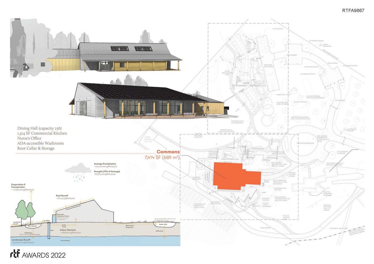 Mindfully developed within 8.2 acres, The Ecology School’s new campus is on track to become one of the nation’s most sustainable residential environmental learning centers and the first certified International Living Future Institute Living Community. The first phase of the project, completed in 2021, installed a new Dining Commons with a commercial kitchen and trio of interconnected Dormitories containing 144 beds. Future work will introduce a second, smaller dormitory, staff housing, and renovations to the site’s original farmhouse and barn.