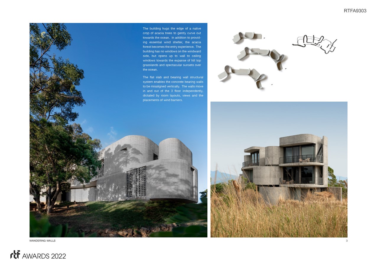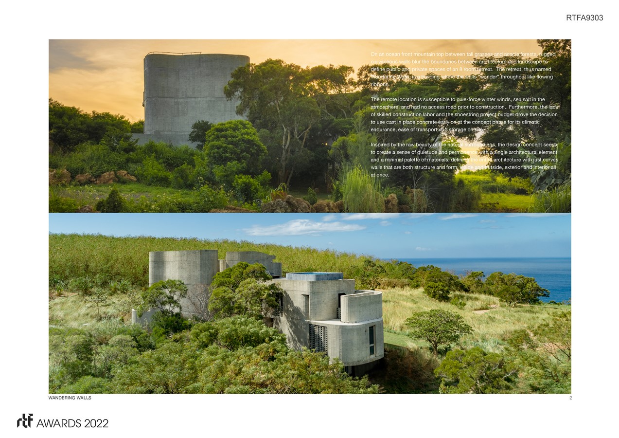On an ocean front mountain top between tall grasses and acacia forests, rugged curvaceous walls blur the boundaries between architecture and landscape to define public and private spaces of an 8 room retreat. The retreat, thus named Wandering Walls, is a building where the walls “wander” throughout like flowing ribbons.