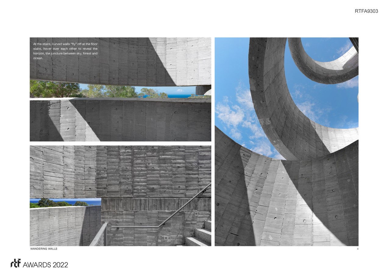 The flat slab and bearing wall structural system enables the concrete bearing walls to be misaligned vertically. The walls move in and out of the 3 floor independently, dictated by room layouts, views and the placements of wind barriers. At the stairs, curve walls hover over each other to reveal the horizon at the juncture of the sky, forest and ocean. The walls fly 4.5m off the 2F and 3F floor plates to form a vertical suspended enclosure, an echo chamber of sorts where the sound of acacia leaves rustling in the strong ocean winds is amplified. On the ground floor, the walls cantilever off the floor slab to form courtyards.