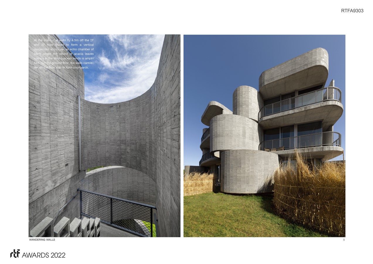 Inspired by the raw beauty of the natural surroundings, the design concept seeks to create a sense of quietude and permanence with a single architectural element and a minimal palette of materials; defining the entire architecture with just curves walls that are both structure and form, inside and outside, exterior and interior all at once.