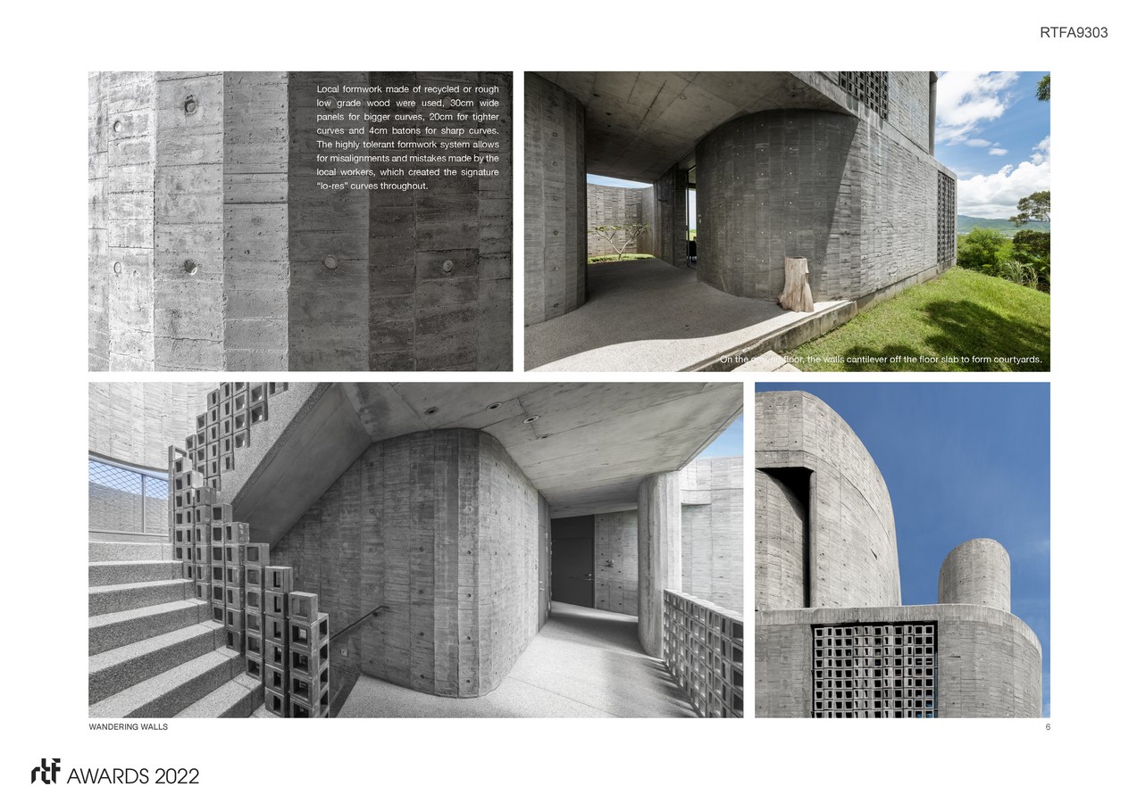 Along their entire lengths, the materiality of the curve walls transitions from rough concrete to wood, metal and tiles. Where the walls hover above ground to create courtyards, red earth stains become a part of the tactile landscape experience. On the windward side, the roughen cast textures of the walls has also gradually smoothen out due to their constant stripping by the seasonal winds.