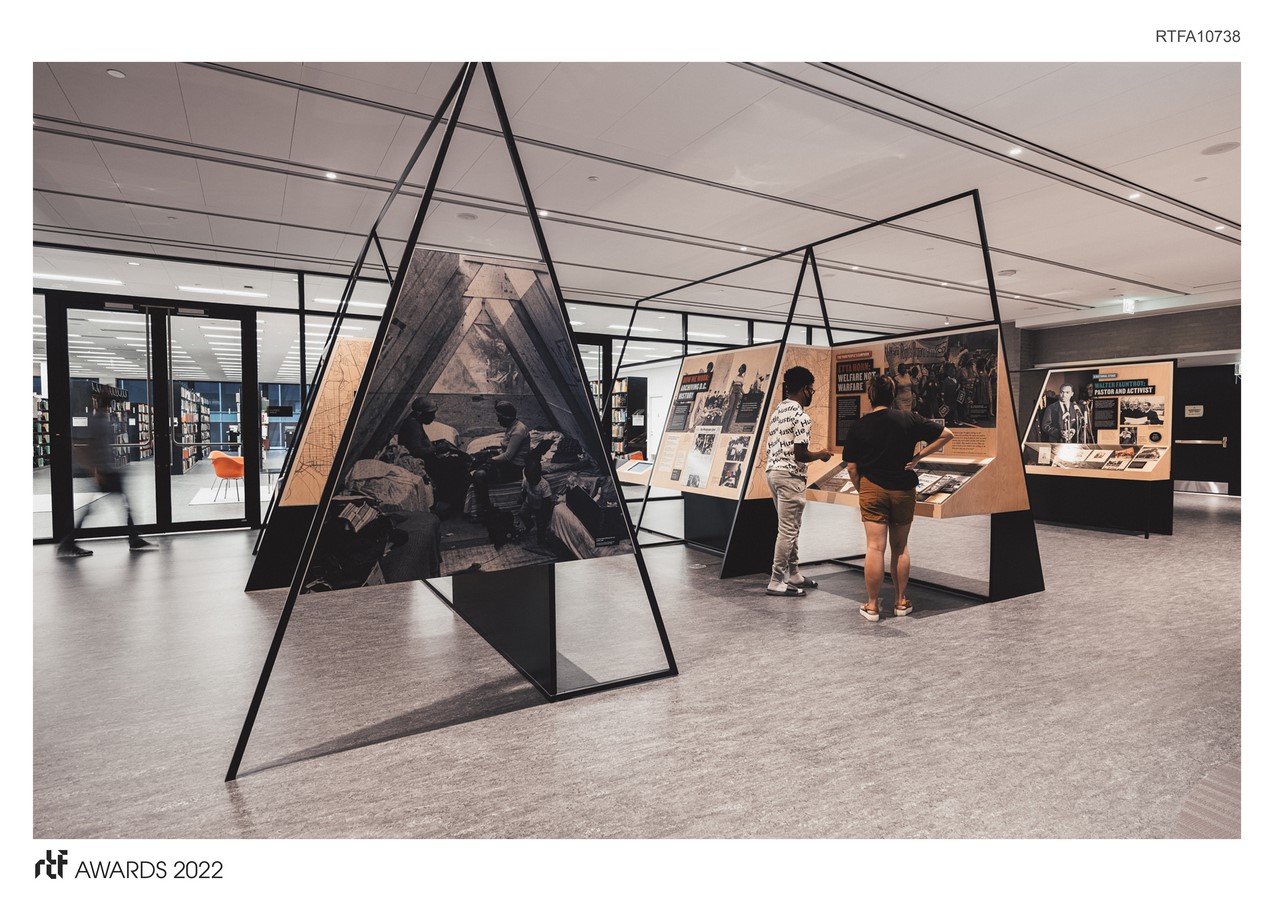 “Up From the People: Protest and Change in D.C.” is a community gallery and Welcome Center at MLK Jr. Memorial Library in Washington, D.C. As part of an extensive renovation of their Mies Van der Rohe building, the Library sees the permanent exhibition space on the 4th floor as a central element of creating a more welcoming place for residents. The 8,000SF space encompasses displays, films, music videos, public feedback opportunities, historical narrative, and engagement space. These areas provide vibrant, content-driven opportunities for community members to learn about D.C.’s crucial role in the civil rights movement,ย local culture, and the drive towards representation in the federal government. A “community gallery” displays highly personal artifacts that tell broader cultural and political history.