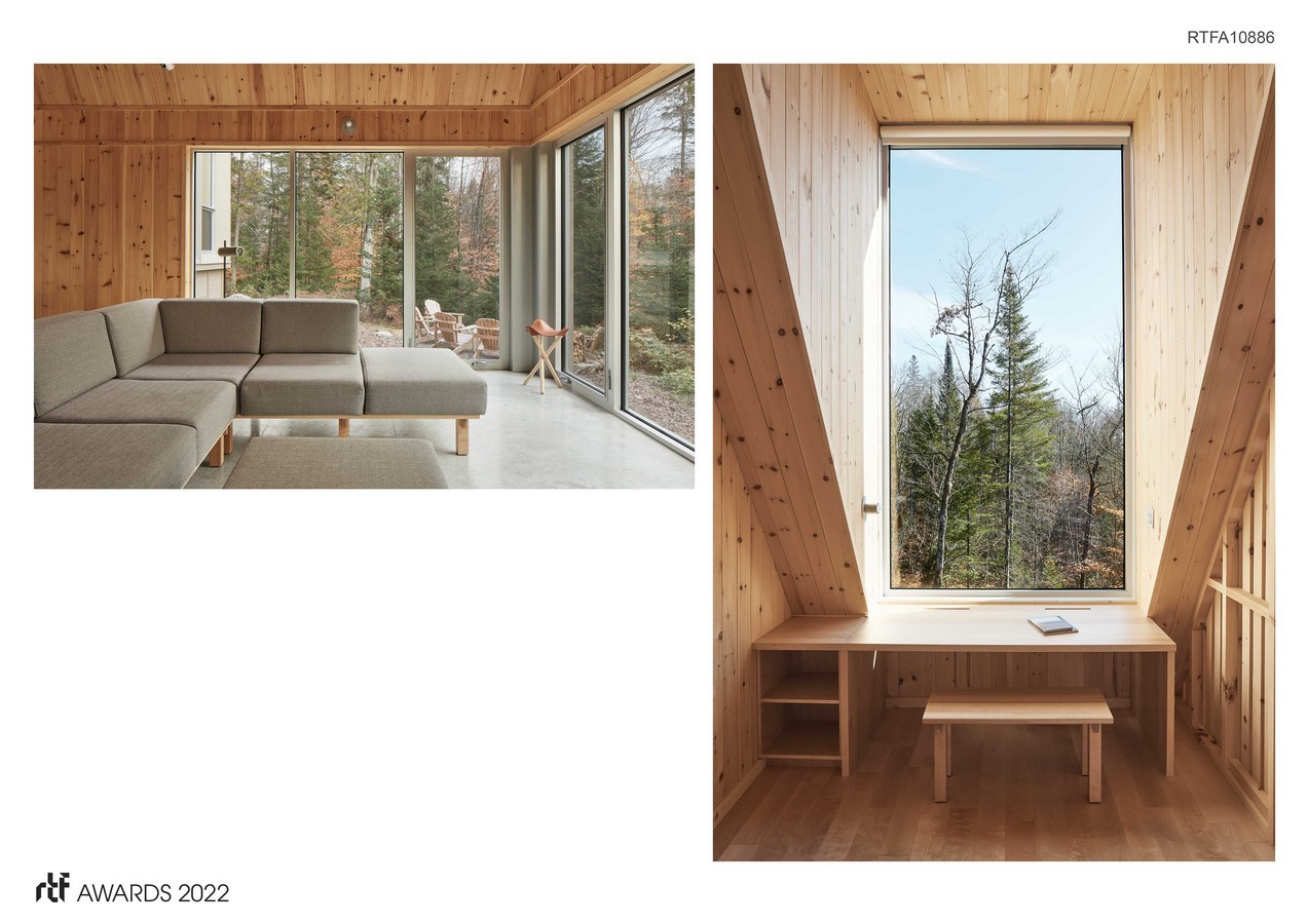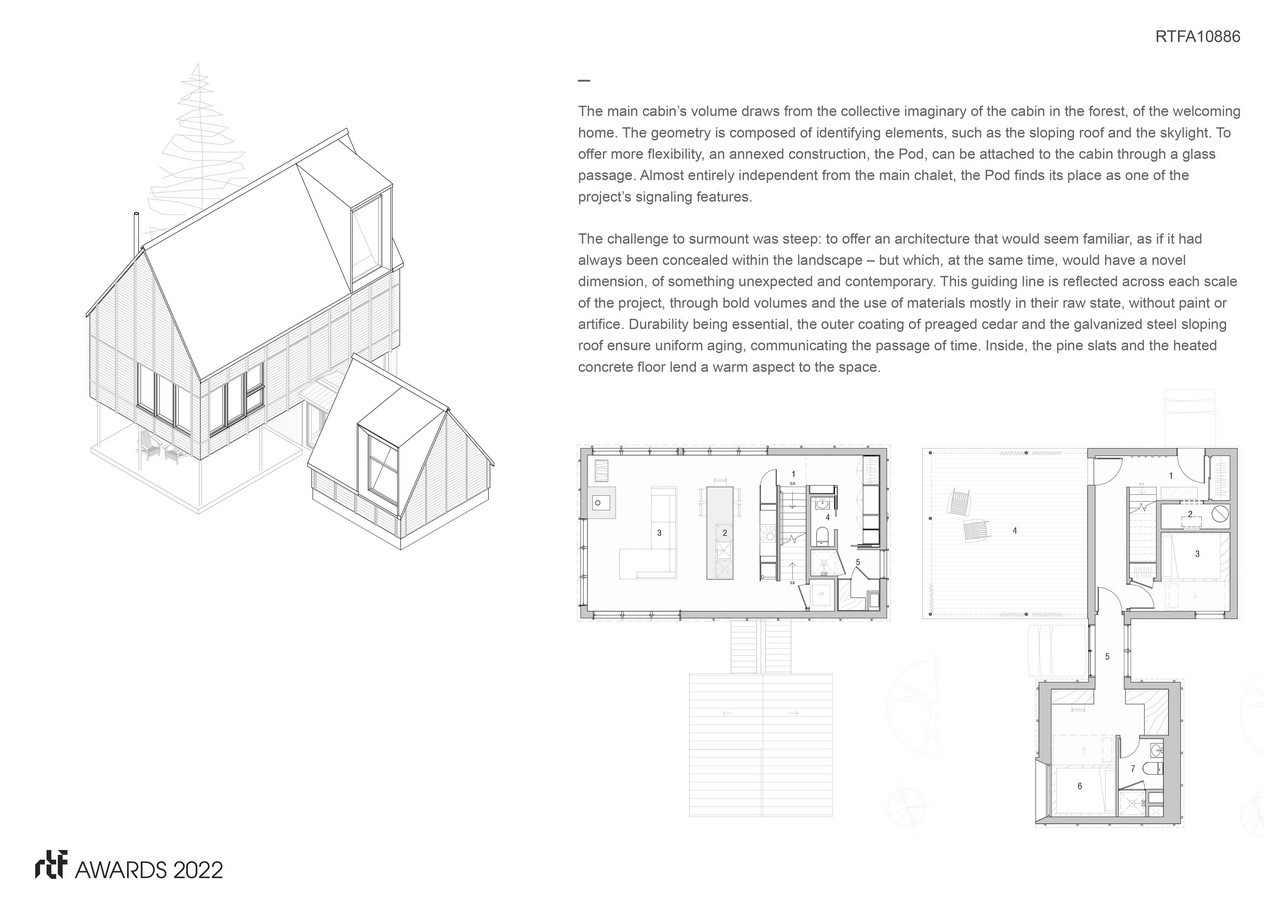 The main cabin’s volume draws from the collective imaginary of the cabin in the forest, of the welcoming home. The geometry is composed of identifying elements, such as the sloping roof and the skylight. To offer more flexibility, an annexed construction, the Pod, can be attached to the cabin through a glass passage. Almost entirely independent from the main chalet, the Pod finds its place as one of the project’s signaling features.