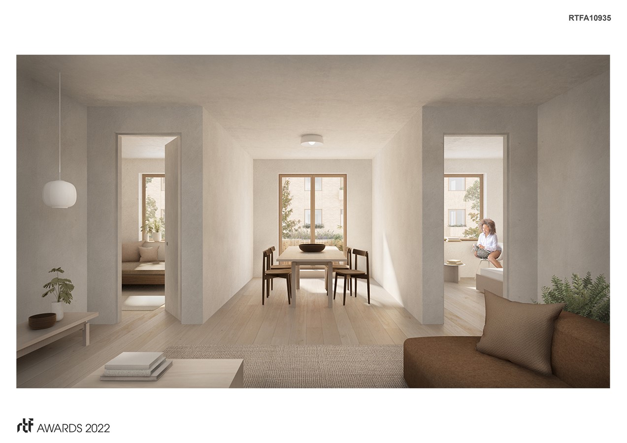 By simplifying the buidlings core and drafting the whole plan system on strict building modules, we allow ressources to be utilized where they have the highest impact on the quality of life of the future residents. Our small modular grid allows for wood construction, while creating exceptional communal spaces for the residents on the roofs and within the central courtyard.