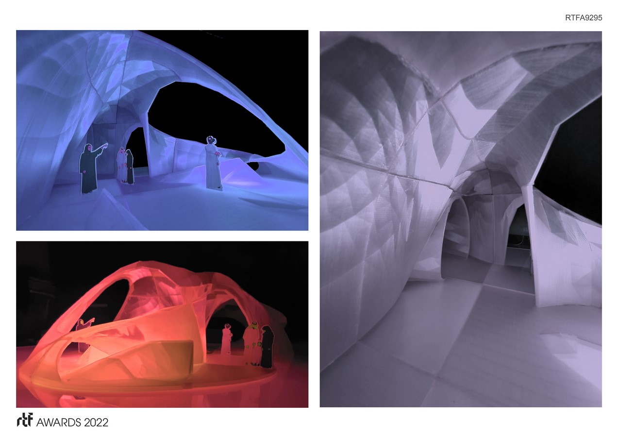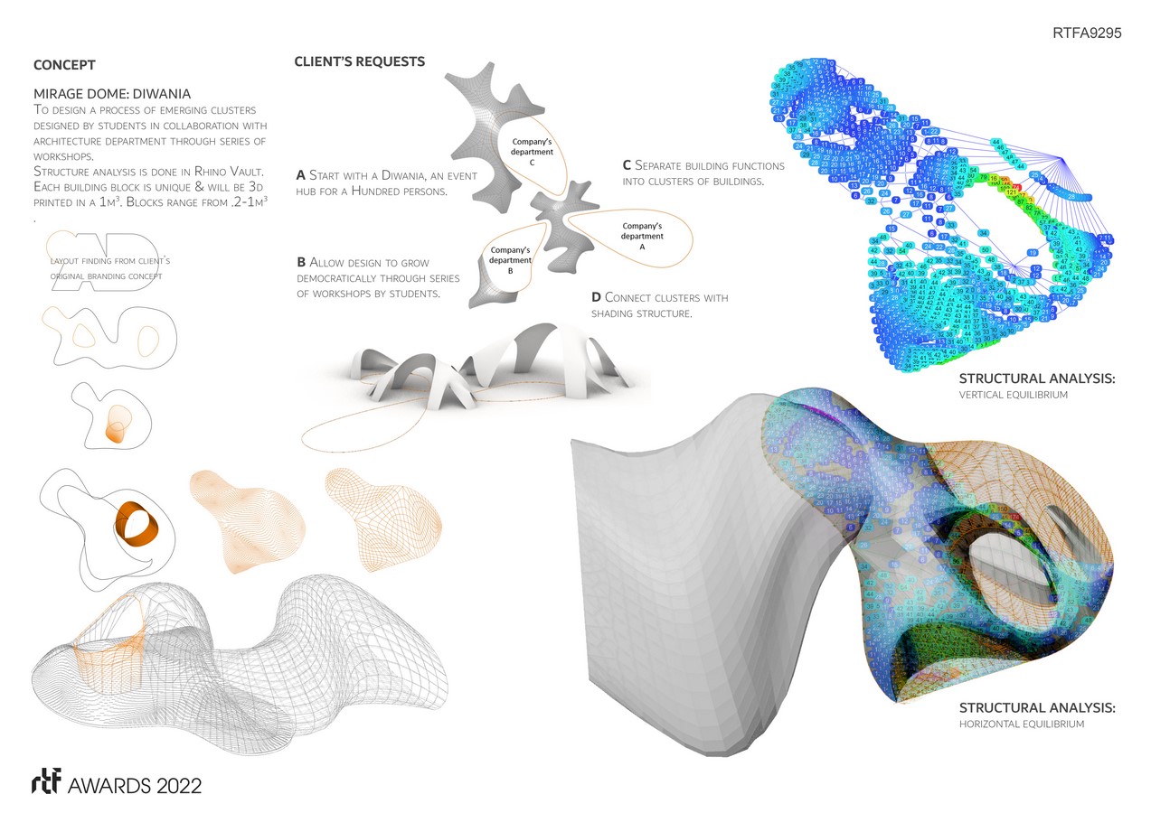 Diwania’s is an organic shaped structure consists of unique individual blocks. The blocks consist of an integrated Male/Female joints to connect to its neighboring block. Anyway the force of compression should help keeping the blockes in place. There are series of vaults like structure that are functioning as shading and entrance. These vaults are nodes between different departments providing shelter from weather. The design of these nodes resemble a brain where the Diwania is its central cell connecting with other cells through the vaults.