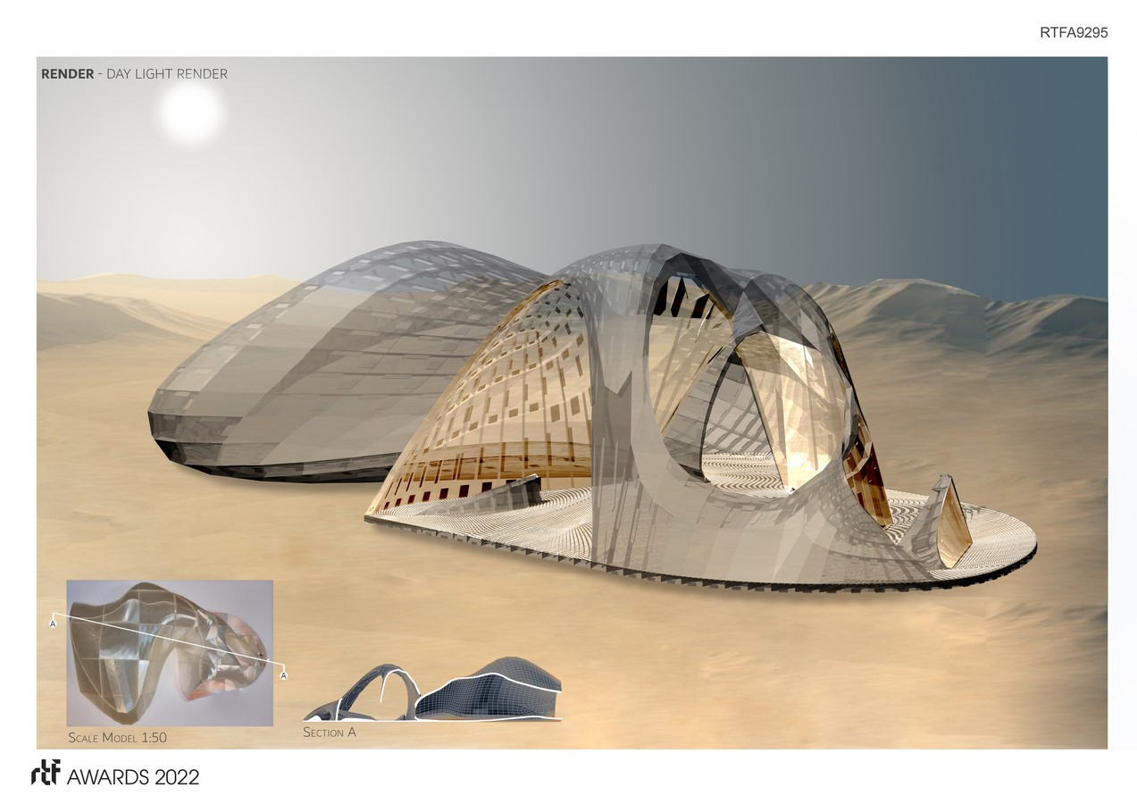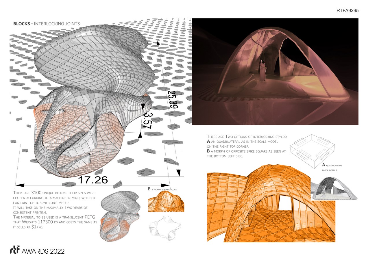 The structure based on the ancient methods of building domes and vaults to create large volumes without columns. Therefore, we decided to build the building blocks using the innovative large scale plastic 3D printer of a machine of One cubic meter in volume. This led to understanding not only traditional building methods, but also understanding the building blocks in the software. The opensource advanced software allowed us to calculate the strength of the building, freeing design from civil engineers thus leading to calculated decision making. Allowing the students to design creatively within the boundaries of the construction method, material and software.