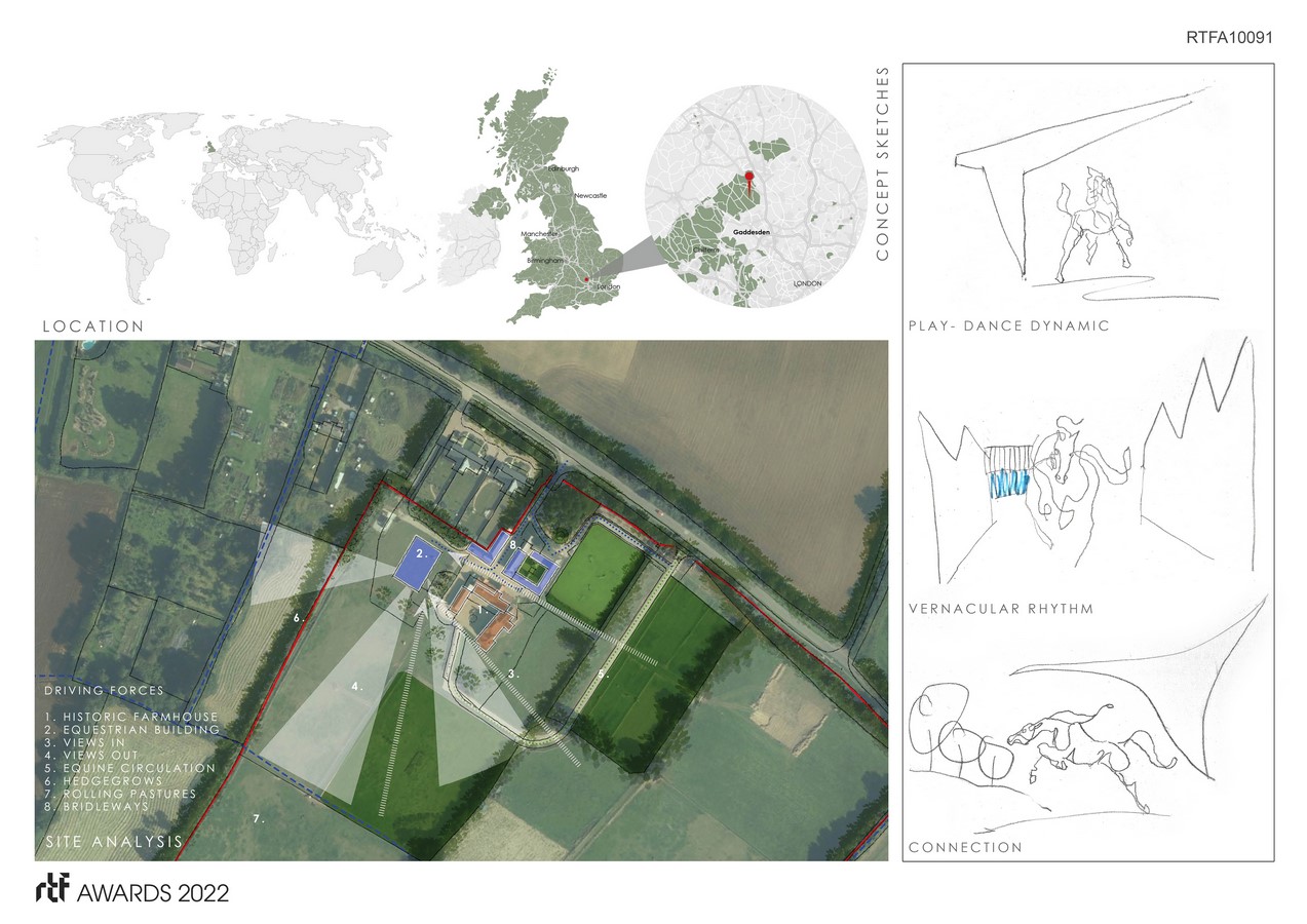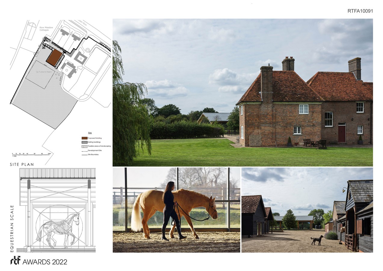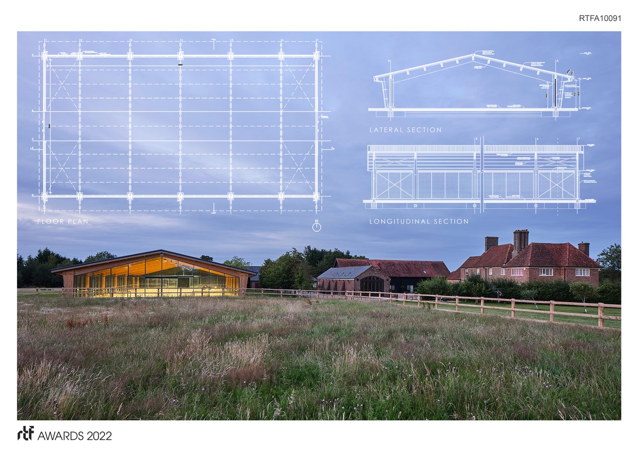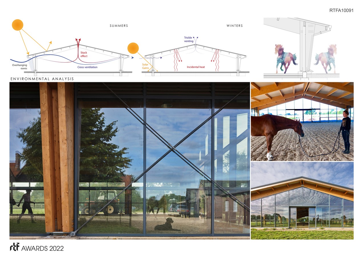 Nestling into the farm vernacular the arena terminates the rhythm of traditional gables in the stable yard. The farmhouse as host structure remains the dominant form in the composition while the arena sits comfortably distinct- a display of modernity and tradition, of light and mass.
