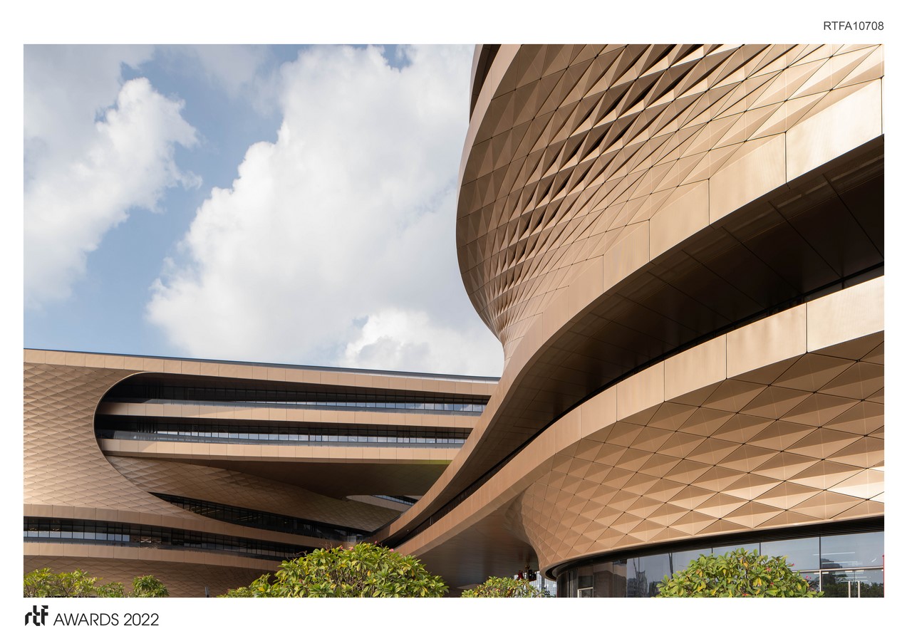 Built on the site of the decommissioned Baiyun Airport, the new district links Guangzhou’s city centre with Feixiang Gongyuan Park and the new communities within the former airport’s redevelopment. Located adjacent to Feixiang Park metro station, the 185,643m2 Infinitus Plaza straddles the metro’s sub-surface tunnel, dividing the headquarters into two buildings that interconnect at multiple levels.