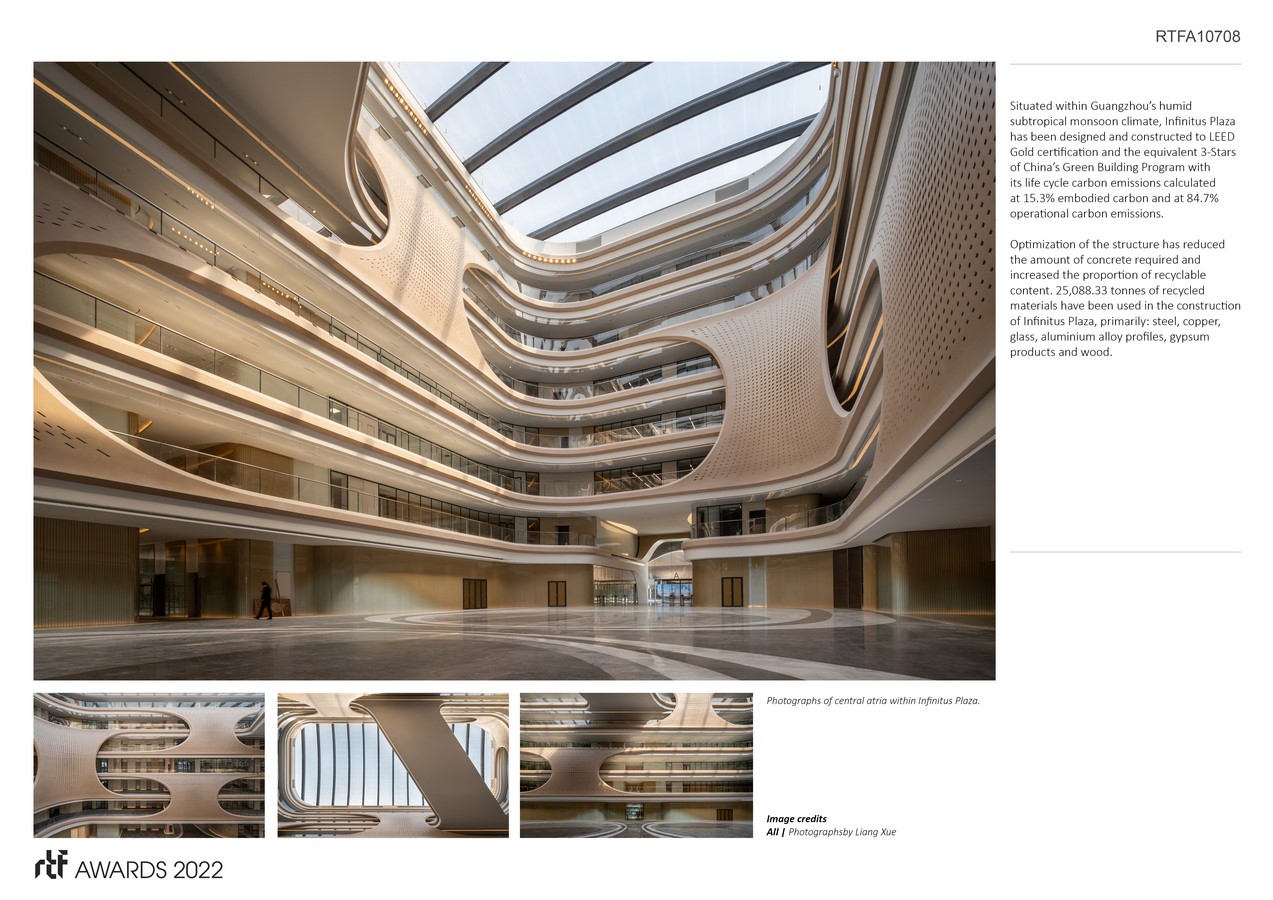 Situated within Guangzhou’s humid subtropical monsoon climate, Infinitus Plaza has been designed and constructed to LEED Gold certification and the equivalent 3-Stars of China’s Green Building Program with its life cycle carbon emissions calculated at 15.3% embodied carbon and at 84.7% operational carbon emissions.