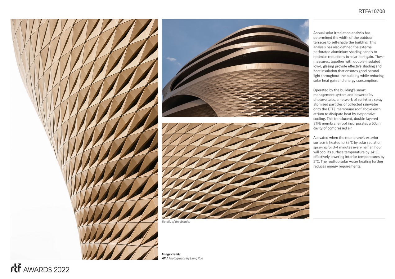 Operated by the building’s smart management system and powered by photovoltaics, a network of sprinklers spray atomised particles of collected rainwater onto the ETFE membrane roof above each atrium to dissipate heat by evaporative cooling. This translucent, double-layered ETFE membrane roof incorporates a 60cm cavity of compressed air.