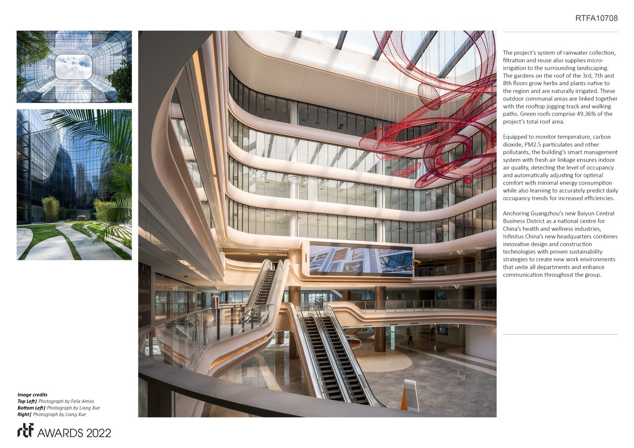Anchoring Guangzhou’s new Baiyun Central Business District as a national centre for China’s health and wellness industries, Infinitus China’s new headquarters combines innovative design and construction technologies with proven sustainability strategies to create new work environments that unite all departments and enhance communication throughout the group.