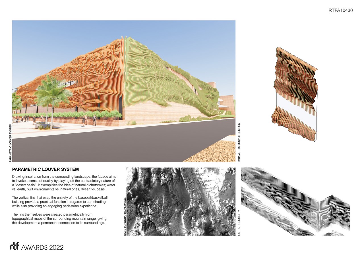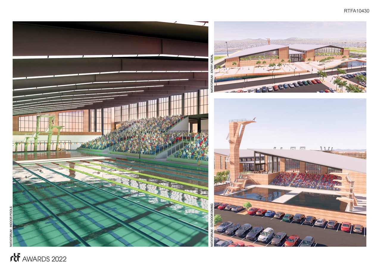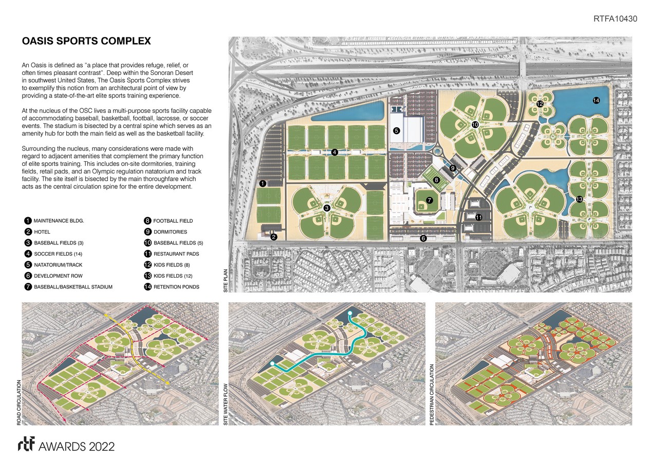 An Oasis is defined as “a place that provides refuge, relief, or often times pleasant contrast”. Deep within the Sonoran Desert in southwest United States, The Oasis Sports Complex strives to exemplify this notion from an architectural point of view by providing a state-of-the-art elite sports training experience.