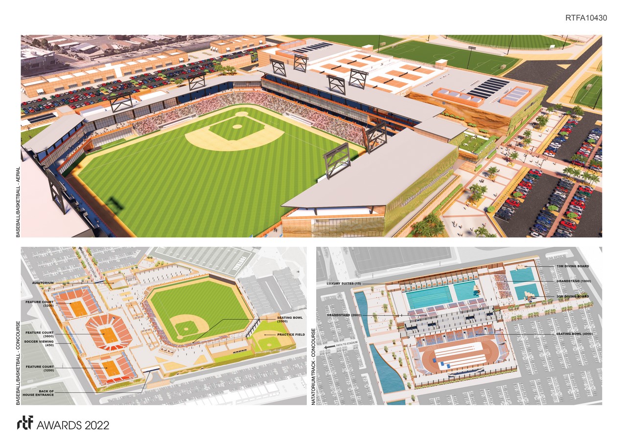 Surrounding the nucleus, many considerations were made with regard to adjacent amenities that complement the primary function of elite sports training. This includes on-site dormitories, training fields, retail pads, and an Olympic regulation natatorium and track facility. The site itself is bisected by the main thoroughfare which acts as the central circulation spine for the entire development.