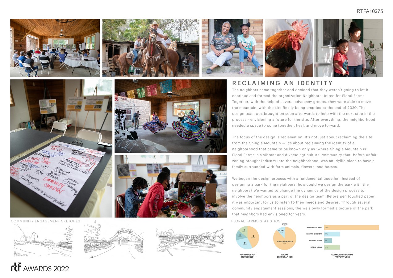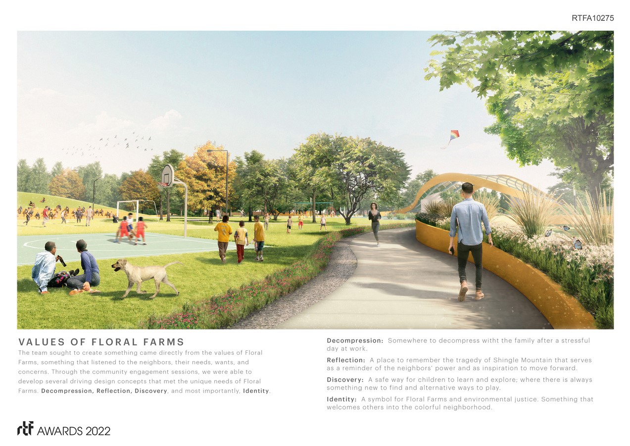 Many of their requests were tangible— a soccer field, walking paths, and a splash pad for children to play— but several experiential desires became integral in guiding the design’s development. Along with decompression, and discovery, identity was at the top of the list. Through a series of additional community engagement sessions, the design team gave form to a vision that Floral Farms neighbors had been dreaming up for years.