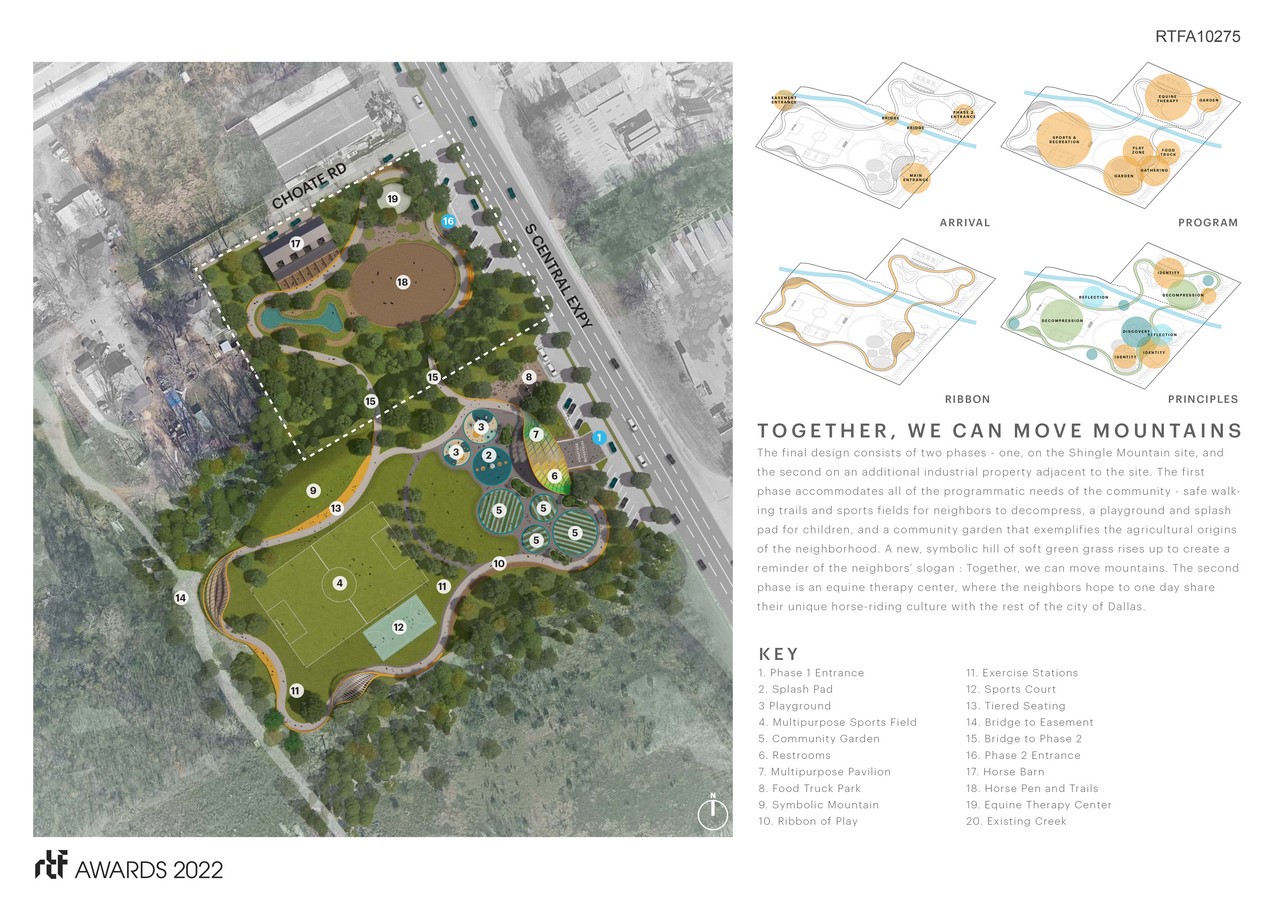 The design brings the neighbors’ vision to life through a process that focused first on listening to the neighbors’ needs and wishes, and advising them on how design can help achieve their goals. This collaborative process, where the architects designed the park with the neighbors, rather than for the neighborhood, allowed the project to become a dynamic place of environmental justice — a place that brings people together, a place that heals, and reclaims what was never lost, but hidden in the shadows of a mountain.