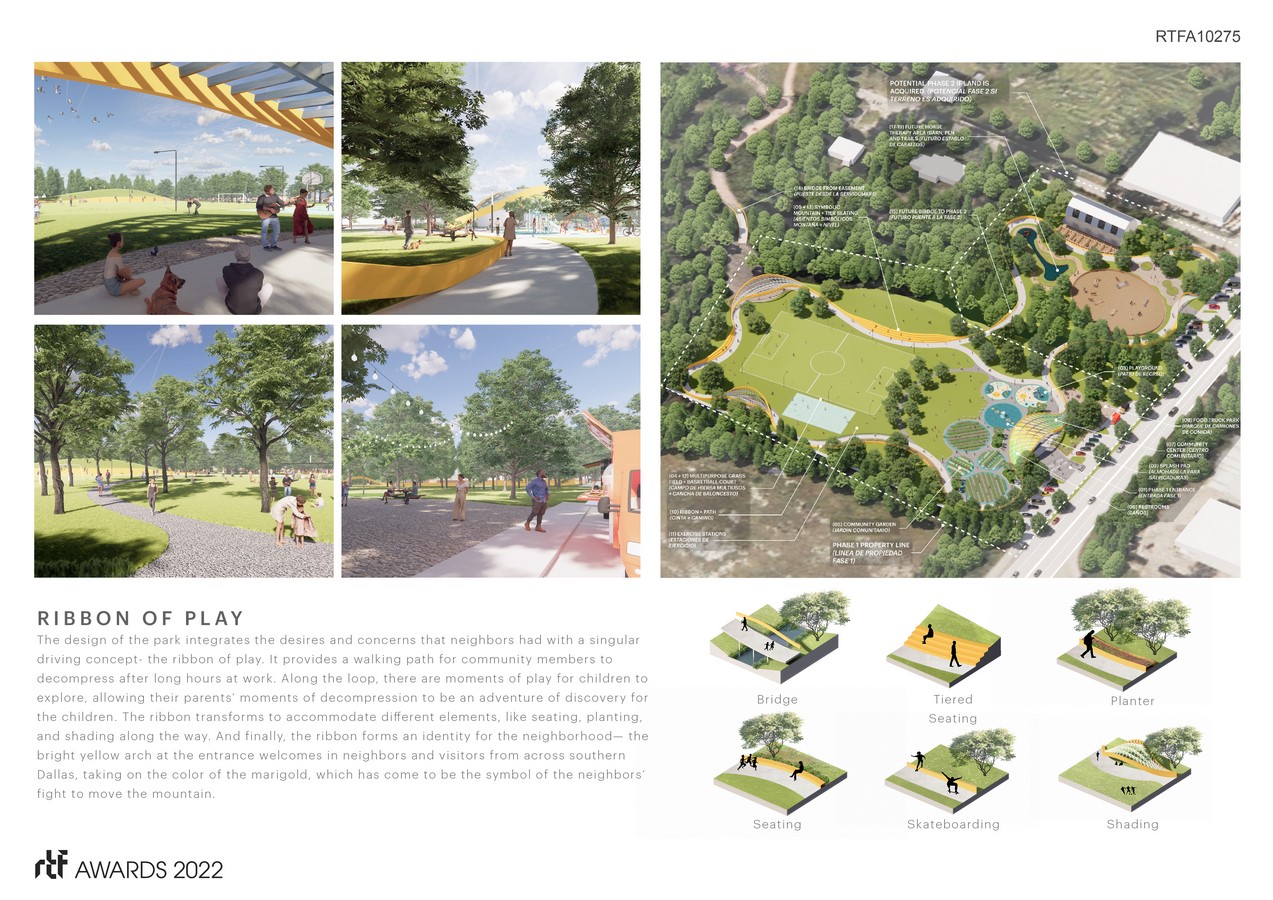 The driving design concept for the park is a ribbon-of-play that integrates the experiential desires of the neighbors into a singular, united form. It provides a walking path for community members to decompress after long hours at work. Along the loop, there are moments of play for children to explore, allowing their parents’ moments of decompression to be an adventure of discovery for the children. The ribbon transforms to accommodate different elements, like seating, planting, and shading along the way. And finally, the ribbon forms an identity for the neighborhood— the bright yellow arch at the entrance welcomes in neighbors and visitors from across southern Dallas, taking on the color of the marigold, which has come to be the symbol of the neighbors’ fight to move the mountain.